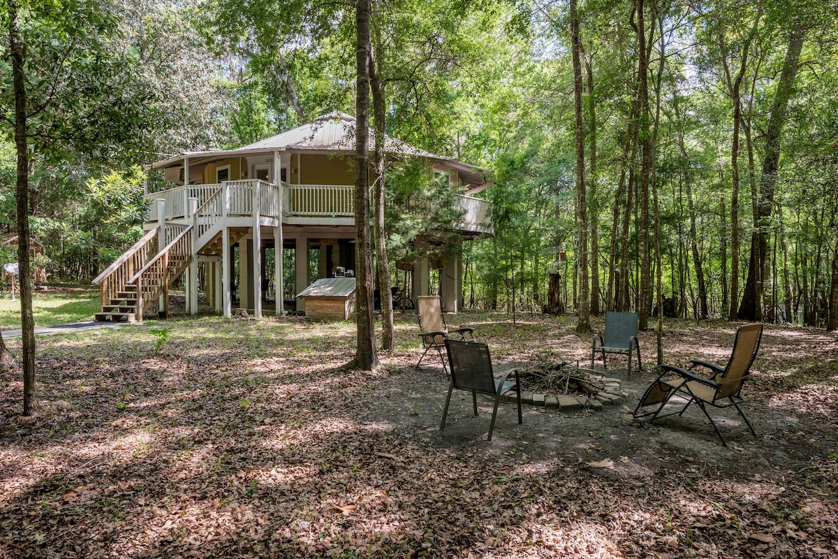 Spend all the time you want at home in Nature relaxing or recreating. This unique treehouse home is set high up in the trees and on 13 acres of natural habitat on the banks of the Santa Fe River. The Santa Fe has so much wildlife, and we are near the famous crystalline Ichetucknee River and miles of public trails. We share our kayaks, a canoe, and many amenities for your stay. So go for a solo paddle, join local guide trips to various springs, or hike on the property and at nearby parks.