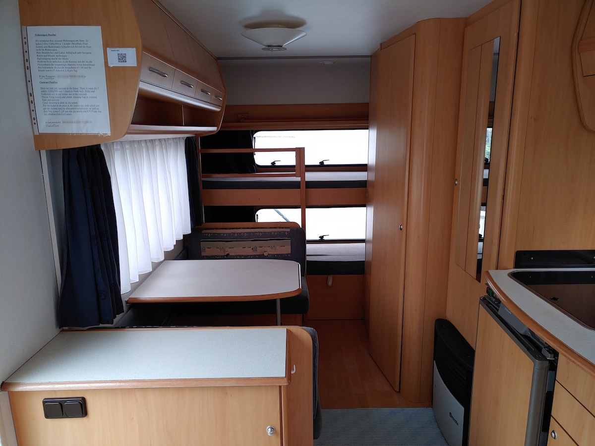 Pronajímáme karavan u našeho domu. Je vhodný pro dva dospělé (140x200) a dvě děti (palandy). Toaleta a sprcha jsou v domě, ne v karavanu. Přineste si prosím ručníky a povlečení, spací pytel nebo si připravte postele a polštáře. Závěrečný úklid je odpovědností nájemce. V ceně není zahrnut turistický poplatek (prosím zaplaťte v hotovosti při příjezdu), který poskytuje zlevněný vstup a bezplatnou autobusovou dopravu. Dospělí 2,20 EUR, děti 6–15 let 0,70 EUR za den.