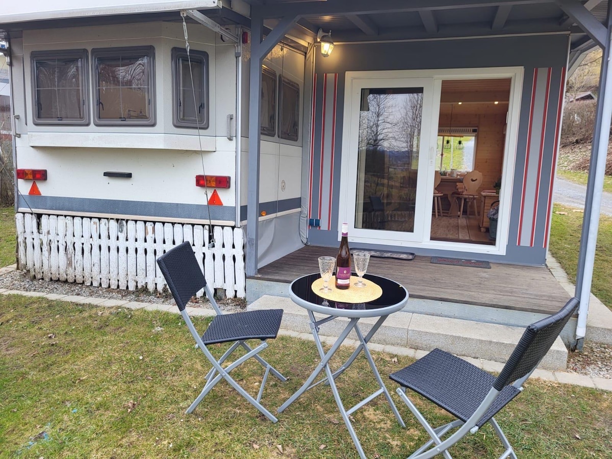 Schöner Wohnwagen(Nichtraucher!!) in ruhigem und abgetrennten Garten. Voll ausgestattet mit Vorzelt zum draußen sitzen.Neues Duschhaus mit Toilette und Wasch- und Spülgelegenheit nur für Euch! Grillmöglichkeit. Dorfladen um die Ecke. Ideal für Wanderer, Fahrrad- und Motorradfahrer. Viele Wander- und Ausflugsmöglichkeiten in der Umgebung. Gerne stehen wir mit Rat und Tat zur Seite. Wir sprechen Deutsch und Englisch