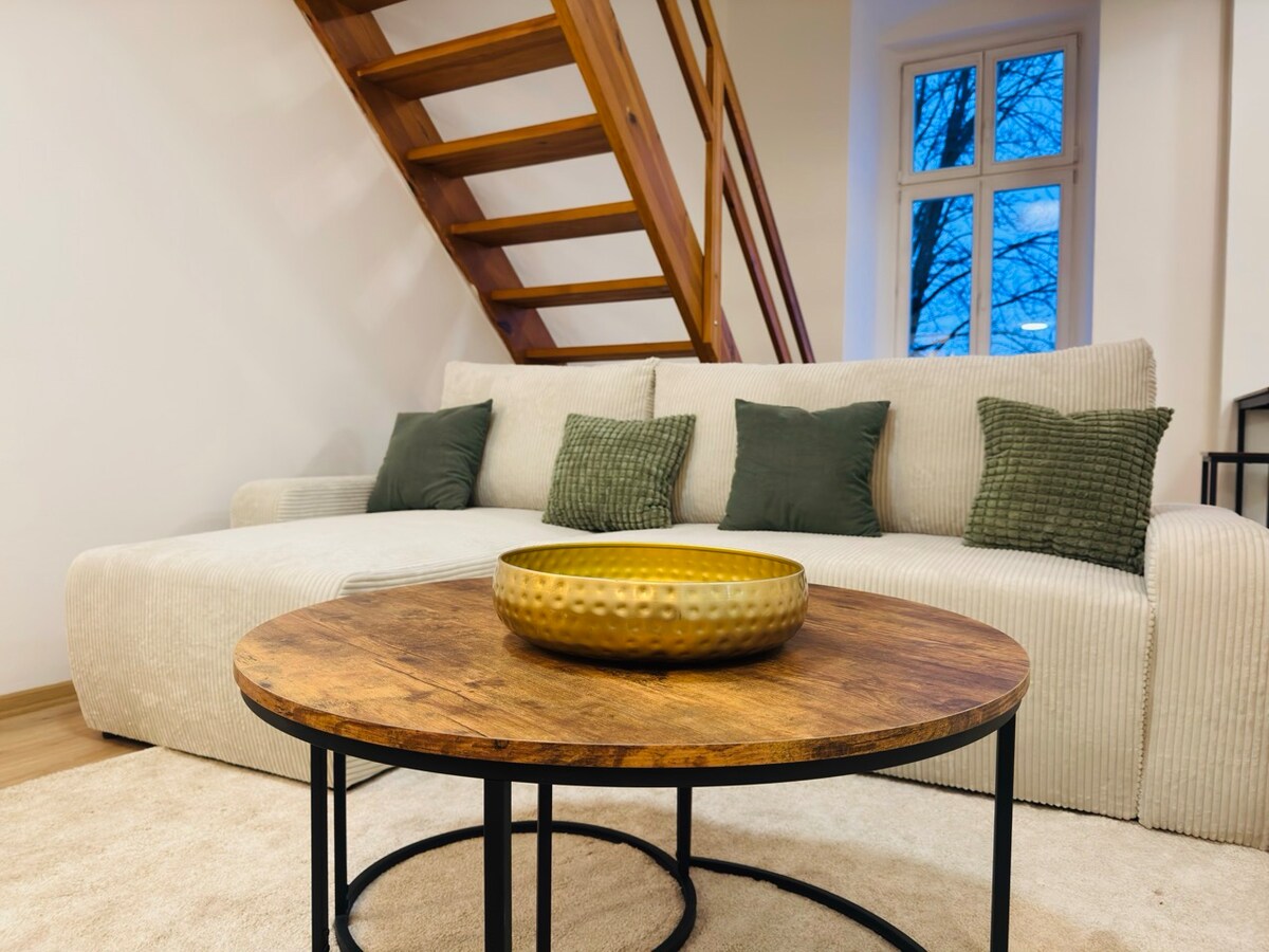 Stylový podkrovní byt se dvěma podlažími, dřevěnými prvky a jedinečnou atmosférou. Ideální pro romantický pobyt nebo odpočinek v klidném prostředí. Parkování zdarma přímo u domu.