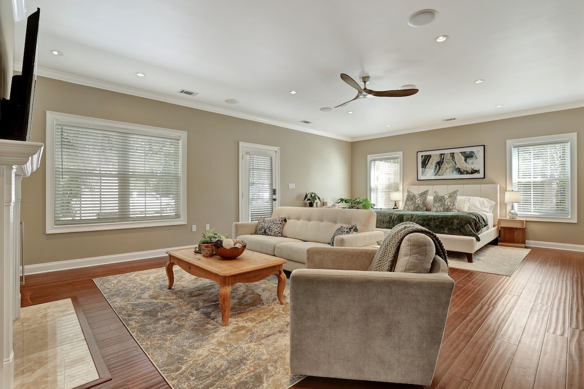 Tento prostor, který se nachází na klidném a historickém ostrově Wilmington, byl navržen jako romantický únik pro páry. Užijte si toto prostorné studio vybavené funkčním vnitřním plynovým krbem, velkou vanou, sprchovým koutem s dlaždicemi od podlahy až ke stropu a venkovní vířivkou. Díky centrální poloze mezi historickou Savannah a ostrovem Tybee si můžete užít jednodenní výlety do těchto úžasných míst a vrátit se do relaxačního a romantického ubytování.