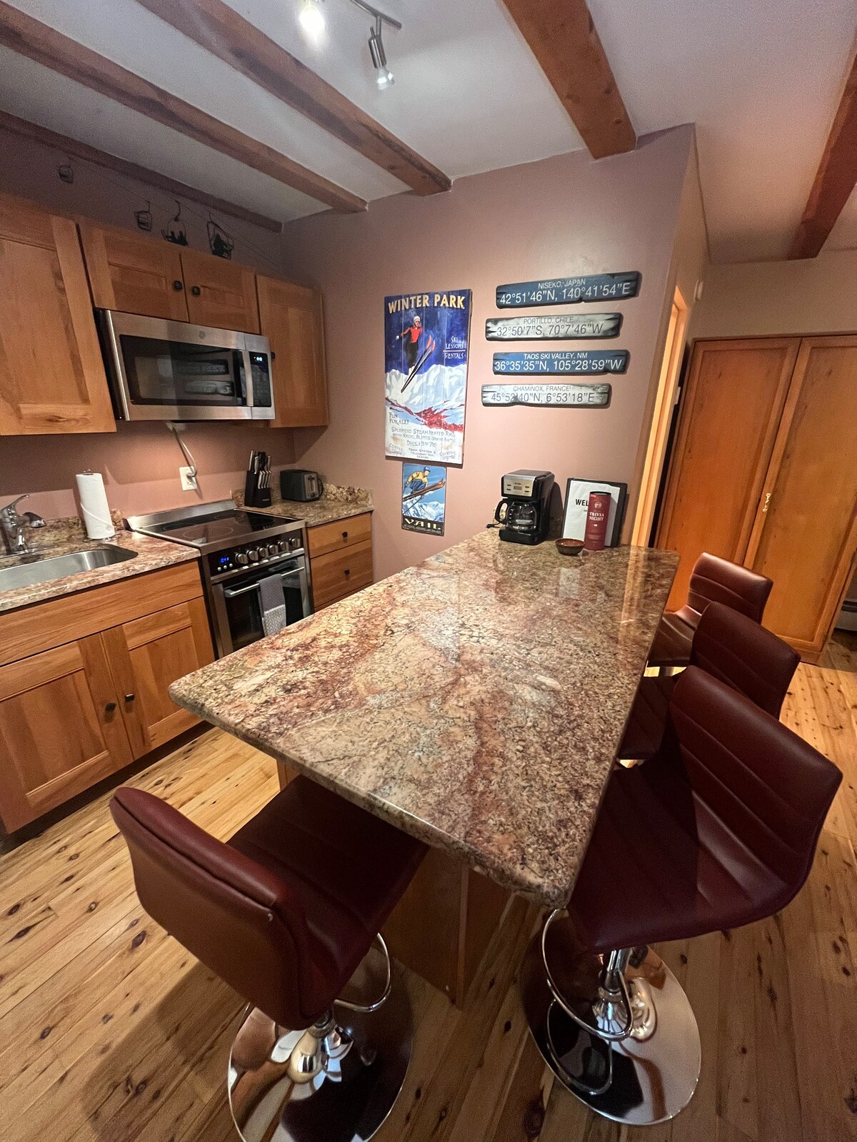 Tento apartmán v horním patře s klenutým stropem na svahu je ideální pro vaše setkání. S využitím podkroví a dvou ložnic se zde ubytuje 8 osob. 2 minuty chůze (bez kopců) k základně, kde si můžete nasadit lyže a lyžovat nebo si užít après ski nebo jinou základní večeři a zábavu. Kuchyně je dobře zásobená a náš hostitel nakoupí a zásobí kuchyni vaším oblíbeným jídlem a nápoji předem. Všechno kvalitní povlečení, nábytek a matrace. Nedávno upgradovaný internet a Wi-Fi.