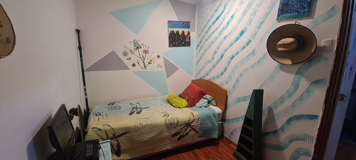 Acogedora pieza, con espacios comunes acogedores, baño compartido incluye un desayuno diario maraqueta con churrasquito y palta o omelette más te con hierbas Luisa o café de grano