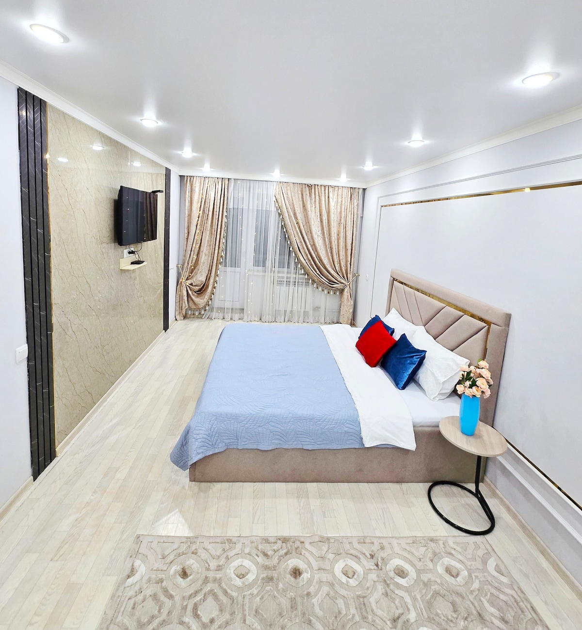 Luxusní dvoupokojový apartmán v samém centru Tarazu. Hosté mají k dispozici veškeré vybavení. V okolí jsou parky, obchody, univerzita TARGU, jídelna Arbat. Byt má veškeré vybavení, aby se naši hosté cítili jako doma. Při příjezdu si účtujeme zálohu ve výši 15 tg. Vratná kauce, kterou host dostane zpět v případě vystěhování.