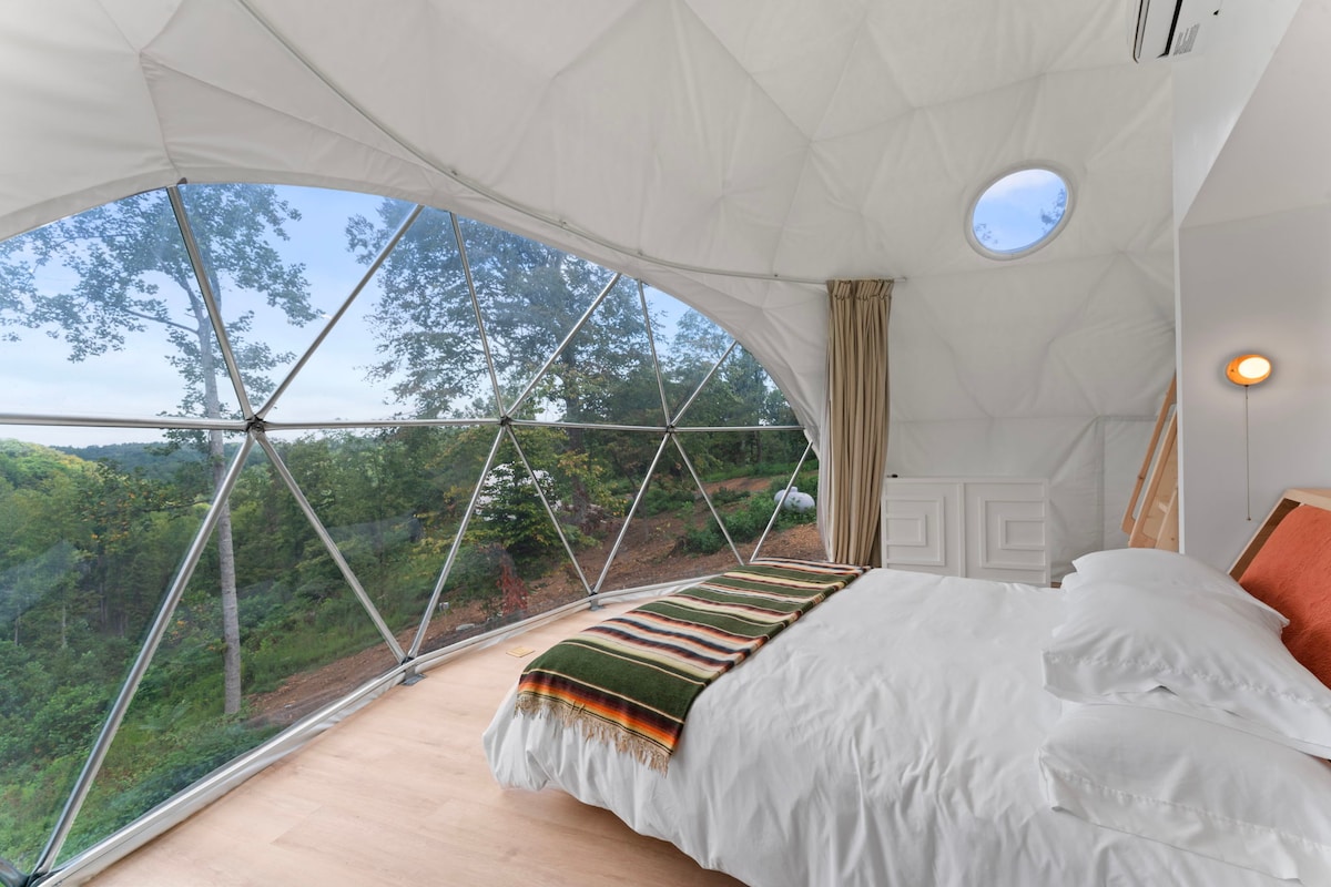 Dopřej si odpočinek v naší designové geodetické glampingové kopuli! Tento luxusní jedinečný glampingový zážitek vám pomůže relaxovat, odpojit se a sladit se s přírodou. Zažijte glamping mimo síť se vším luxusním vybavením! Designový styl ve stylu penthouse, 65palcová televize s Netflixem, Hulu atd., matrace s paměťovou pěnou a plyšové luxusní prostěradlo v ložnici dole a loft s manželskou postelí nahoře! Dvojité umyvadlo a dešťová sprcha s horkou vodou poskytují luxusní 5hvězdičkový hotelový zážitek při kempování!