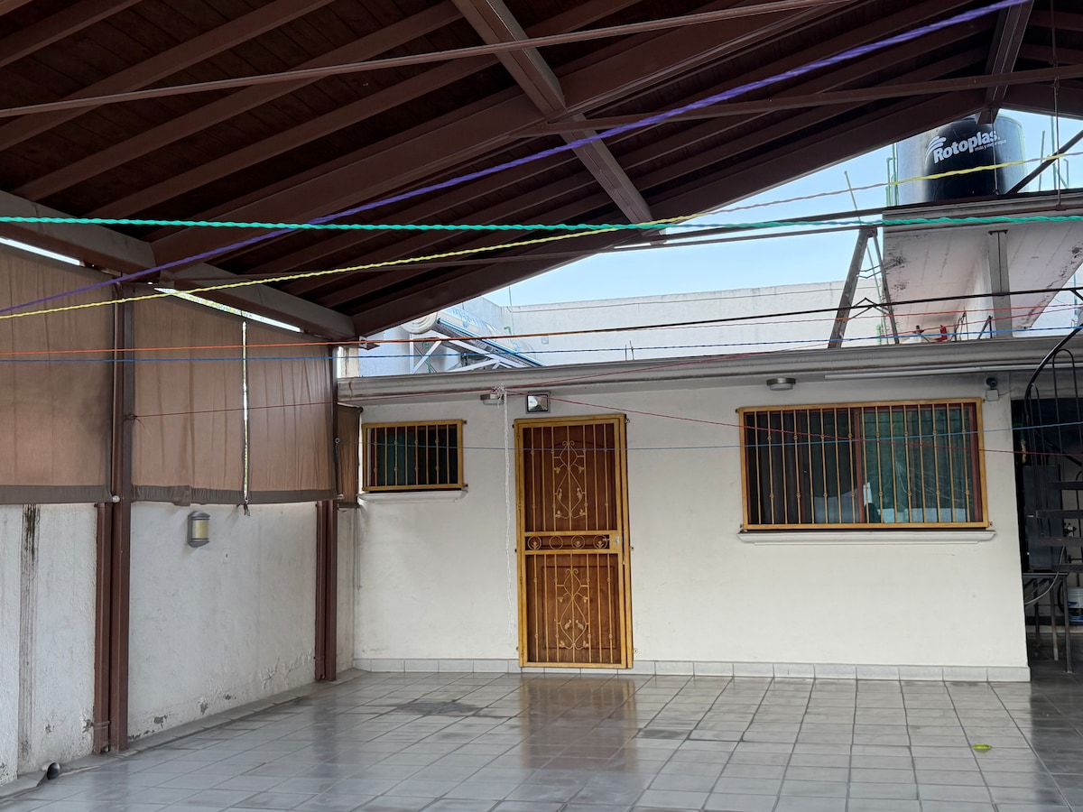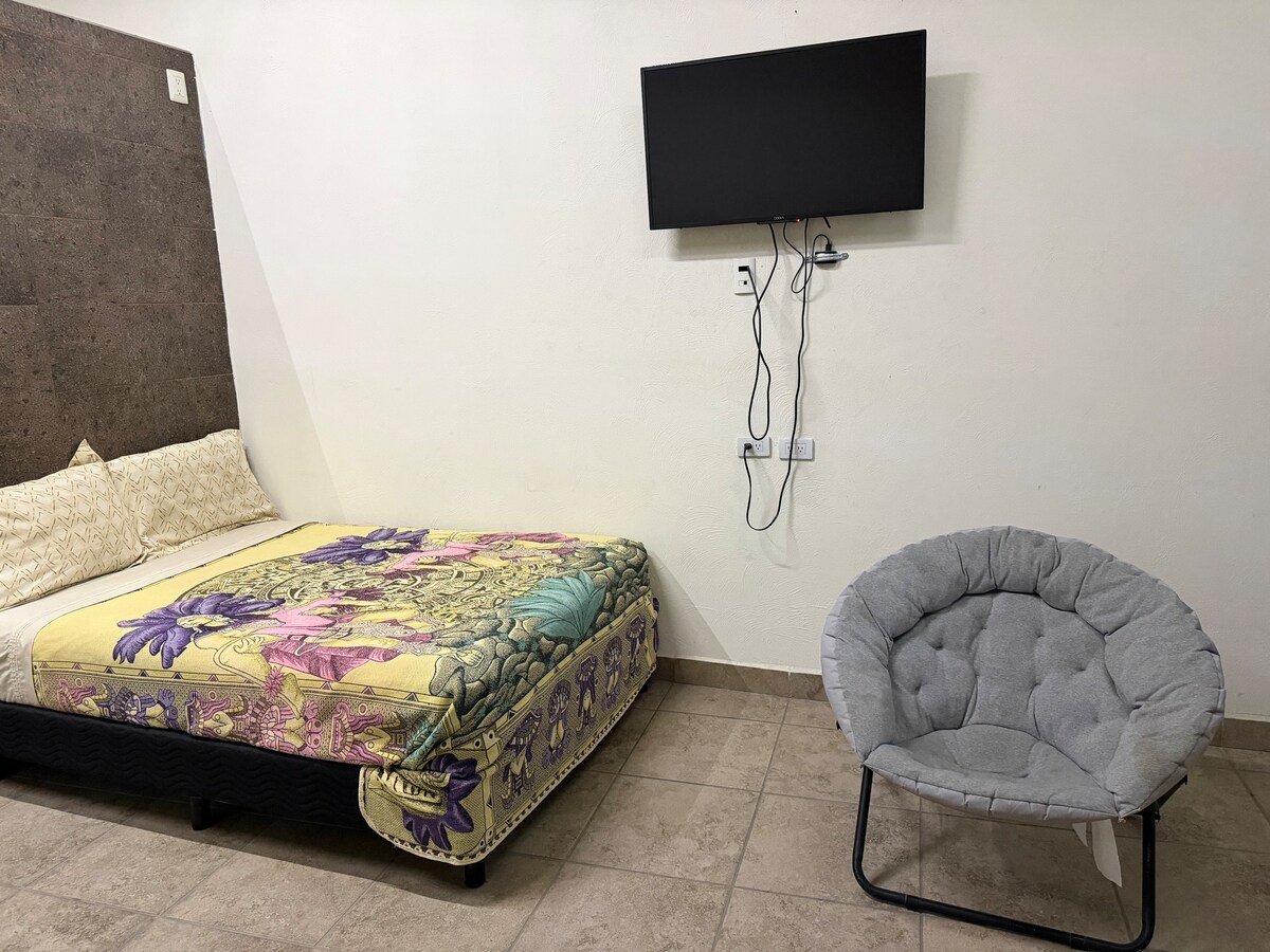 Habitación a 10 minutos del centro de Tepeji, con estacionamiento incluido y mesa al aire libre. La habitación doble cuenta con un baño completo, televisión con cable, una mesa pequeña y un sofá que forma parte de el hotel Chac - Mool