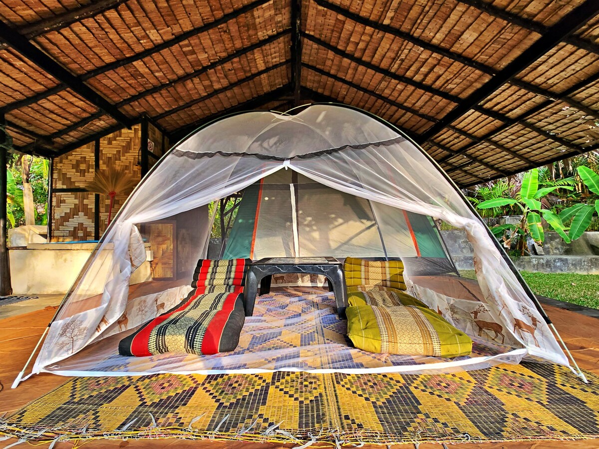 Místo se nachází na vrcholu kopce. Ubytujte se pohodlně ve stanu s přírodou a skvělý výhled na Doi Chiang Dao a rýžové pole. Skvělá základna pro vaše aktivity v okolí. K dispozici je čistá matrace, prostěradlo a přikrývka. Společné WC a koupelna.