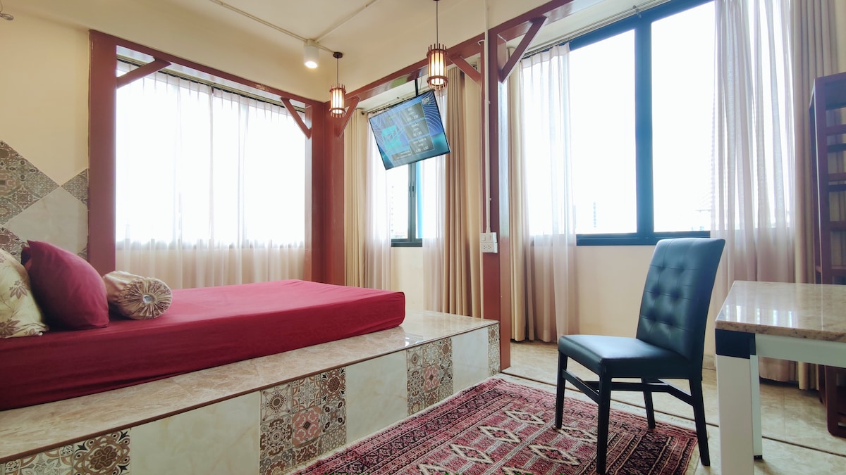Immerse yourself in elegant tranquility at our spacious studio in the heart of Bangkok. Housed in a renovated shophouse, it features a king bed, full kitchen, and a stunning bathroom. Explore the vibrant neighborhood or unwind with complimentary Wi-Fi, Roku TV, and on-site coin-operated laundry. Our mix of comfort, character, and convenience promises an unforgettable city experience. Experience the charm of Bangkok while enjoying modern comforts in a peaceful haven amidst the urban buzz.