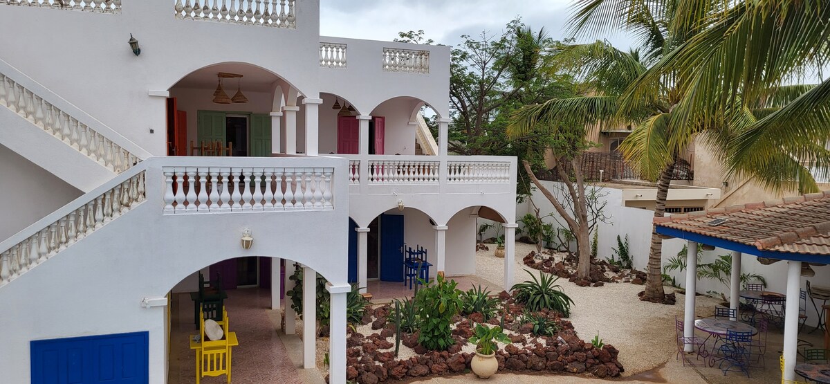 Velký dům s zcela nezávislým bytem, přístupem po venkovních schodech. Tento apartmán si můžeš vychutnat na klidné pláži Choupam s jedinečným a výjimečným výhledem na oceán, který ti pravidelně poskytuje nádherné západy slunce. Caretaker Moustapha je přítomen ve vesnici a bude tě moci přivítat. Je to důvěryhodná osoba, která se o dům od jeho výstavby postarala. Můžeme ti také dát kontakt na mužský taxík, který ti pomůže s tvým výletem