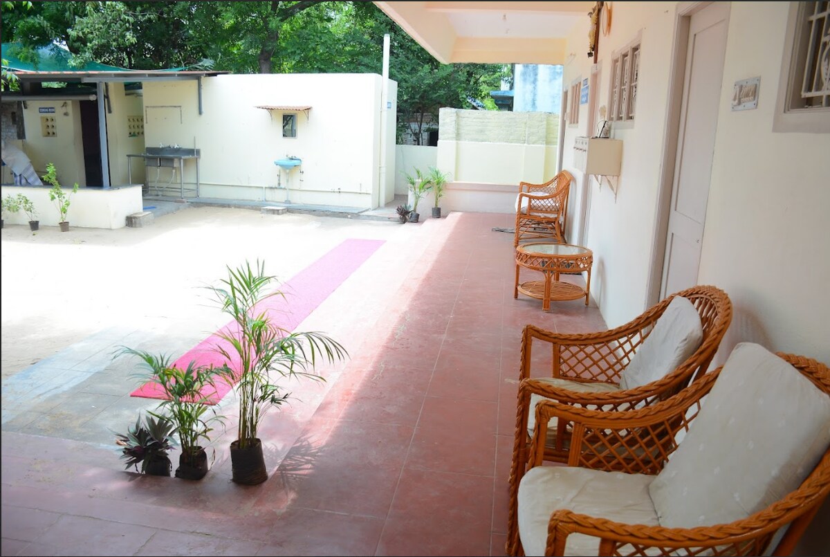 Nejen pobyt – v Kumbakonamu se budeš cítit jako doma! 🌿 Ubytuj se v útulném domově poblíž slavných chrámů v Kumbakonamu s klimatizací, Wi-Fi, kuchyní, bezpečným parkováním a soukromým balkonem. Ložnice má postel velikosti king pro 2 dospělé a 1 dítě. Matrace navíc je k dispozici na vyžádání za příplatek, který se platí v ubytování. Koupelna zahrnuje indické i západní toalety. Můžeme ti zařídit návštěvy chrámu, vyzvednutí/odvoz a prohlídky památek.