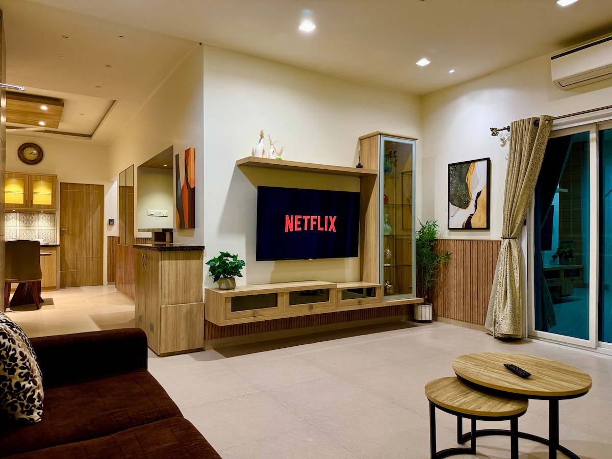 Pohodlný 2BHK v blízkosti letiště | Klimatizace, Wi-Fi, pračka, lednička |