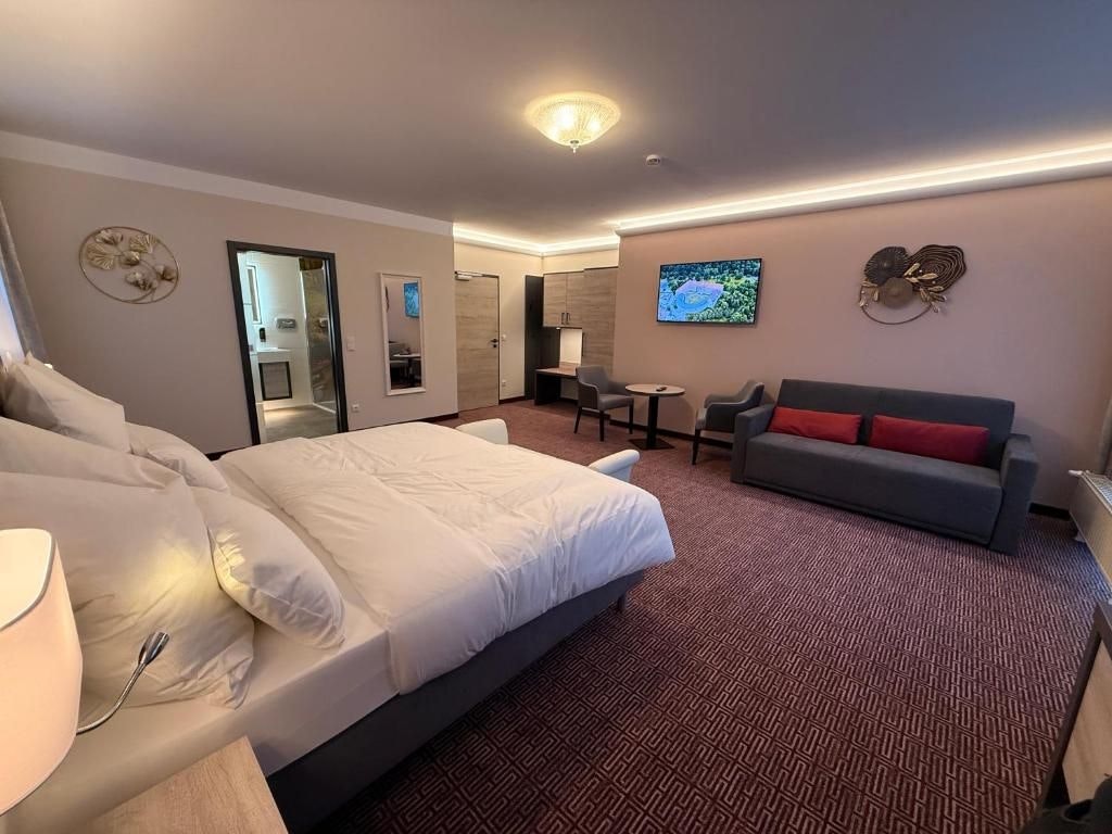 Apartmán M o rozloze 22–24 m² nabízí více prostoru a pohodlí díky velké manželské posteli, sprše a psacímu stolu. Každý pokoj má kuchyňský kout, stůl a sedací kout s křeslem a stolem. Užij si vybavení, jako je TV s plochou obrazovkou, klimatizace, zvukotěsná okna, kávovar Nespresso, reproduktor Teufel a bezplatné Wi-Fi. Upozorňujeme, že 5% turistický poplatek za osobu a noc není zahrnut v ceně Airbnb a musí být zaplacen přímo hotelu.