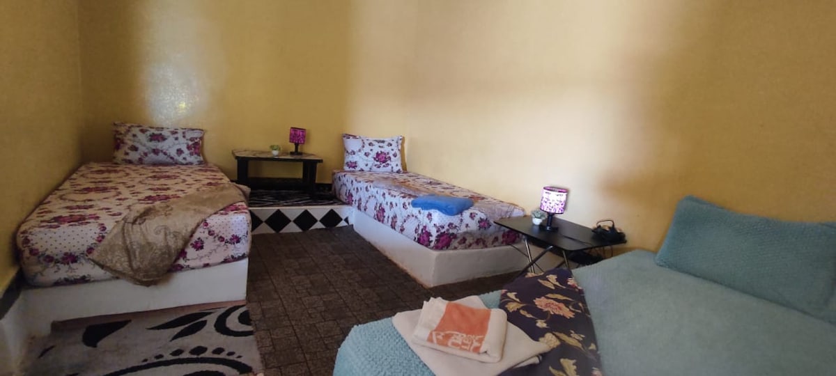 Moderní a klidný apartmán v Beni Mellal, ideální pro rodiny nebo skupiny. Zahrnuje velký marocký obývací pokoj, malý americký obývací pokoj, 2 ložnice (pro 4 osoby), plně vybavenou kuchyň, sprchu a 3 velké balkony. Užij si Wi-Fi, klimatizaci, pračku, chytrý televizor s Netflixem a nové spotřebiče. Nachází se v klidné čtvrti, v blízkosti obchodů. – je velmi důležité, abych měl k dispozici průkaz totožnosti. – v ubytování není alkohol.
