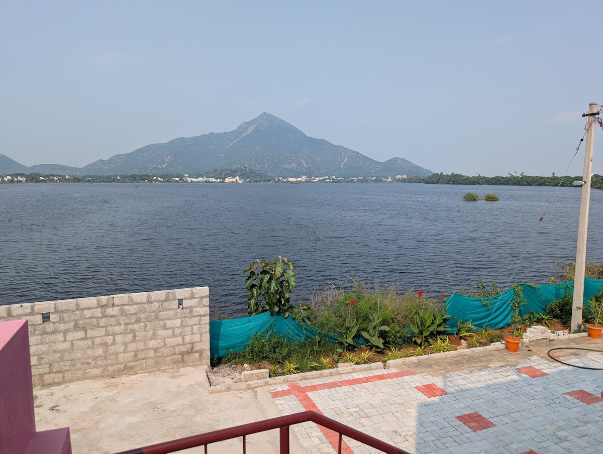 Escape to Ramana Samudram, a serene studio retreat with breathtaking, unobstructed views of the sacred Arunachala Mountain and the expansive Samudram lake. Nestled within a lush 5-acre farm, this independent first-floor studio is a true sanctuary. What makes this place special is its profound tranquility. You can wake up to the sight of peacocks gracefully roaming through our lemon and mango orchards and feel the deep peace of the land.