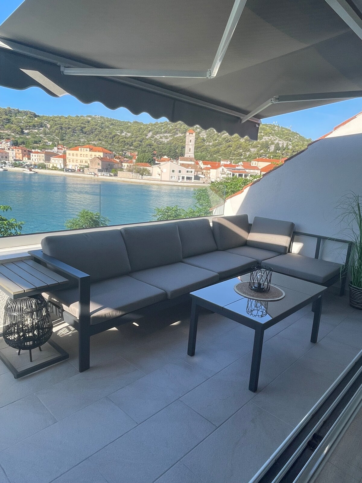 NOVÝ - zrekonstruovaný apartmán s terasou a výhledem na moře. Byt byl letos kompletně přestavěn a nově zařízen. Okolí je klidné a je jen pár minut od dvou doporučených restaurací, centrum je asi 300 m daleko. Velkorysá terasa nabízí dostatek prostoru k pobytu. I psi jsou u nás vítáni. Vzdálenost k festivalu je 15-20 minut pěšky. Pláž je vzdálena 500 metrů, koupání je možné asi 80 metrů daleko.