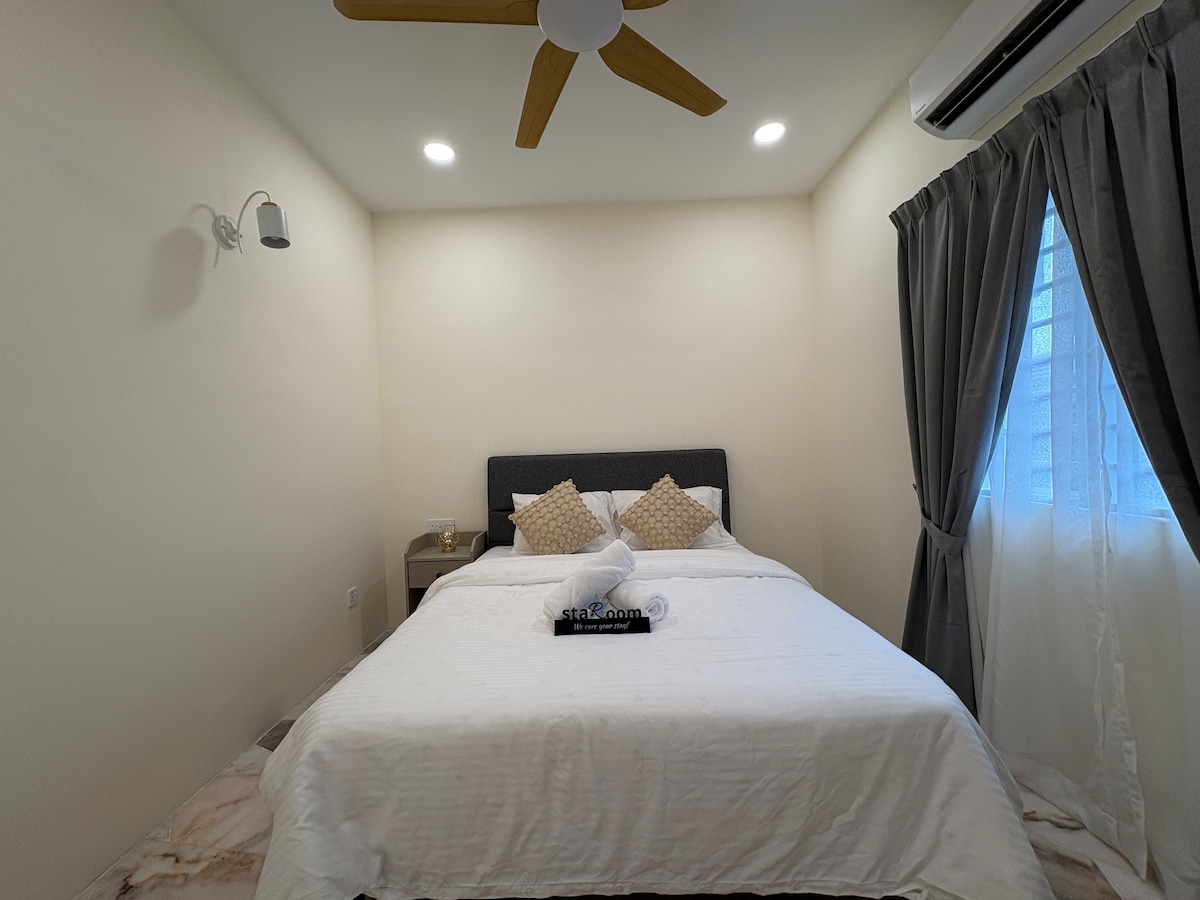 Homestay Landed ( 2-storey terraced house) 2.7km to Cinerea Hall - 3 air-conditioned bedrooms (1 king & 2 queen beds) - 2 Bathrooms + 1 Toilet - 1 kitchen (spacious) - 1 living room (spacious + air conditioning) -1 refrigerator unit - 55 inch TV (Youtube) - Wifi - iron - microvawe - Gas stove - Cuckoo - dishes + utensils for cooking -Washing Machine - gated house area - Car parking within the area house. -24 hours Guard lodge safety Give us 5 star review to redeem rm25 cashback