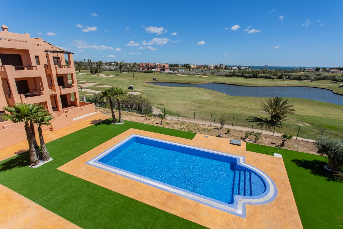 Stylový 2pokojový apartmán v La Torre Golf Resort s úžasným výhledem na golfové hřiště a jezero. Užij si salónek s chytrým televizorem, plně vybavenou kuchyni, moderní koupelnu a dva malé balkony. První patro s výtahem a bezplatným zabezpečeným podzemním parkováním. Odpočiň si na soukromé terase nebo prozkoumej 16 bazénů, tenisové/padelové kurty, hřiště a restaurace. Pouhých 20 minut od pláží Mar Menor – ideální pro golf, rodinnou zábavu nebo klidný odpočinek na slunci!