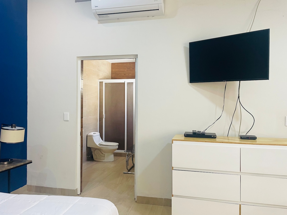 Odpočiň si v tomto jedinečném a klidném útočišti. Pěkný prostor k odpočinku, stěna pokrytá zrcadly, krásná mini vnitřní zahrada ke čtení nebo propojení. Pokud musíš pracovat, budeš mít stůl a pohodlnou židli. TV Netflix, klimatizace, minibar, jídelna a koupelna. Lokalita je nejlepší, protože se můžeš procházet krásnými zahradami. Klinika IMSS 16 71 3 minuty cesty. V tomto domě bydlí někdo další. ŽÁDNÝ nadměrný hluk. Vstupuješ přímo z ulice, ale je to velmi bezpečná čtvrť.