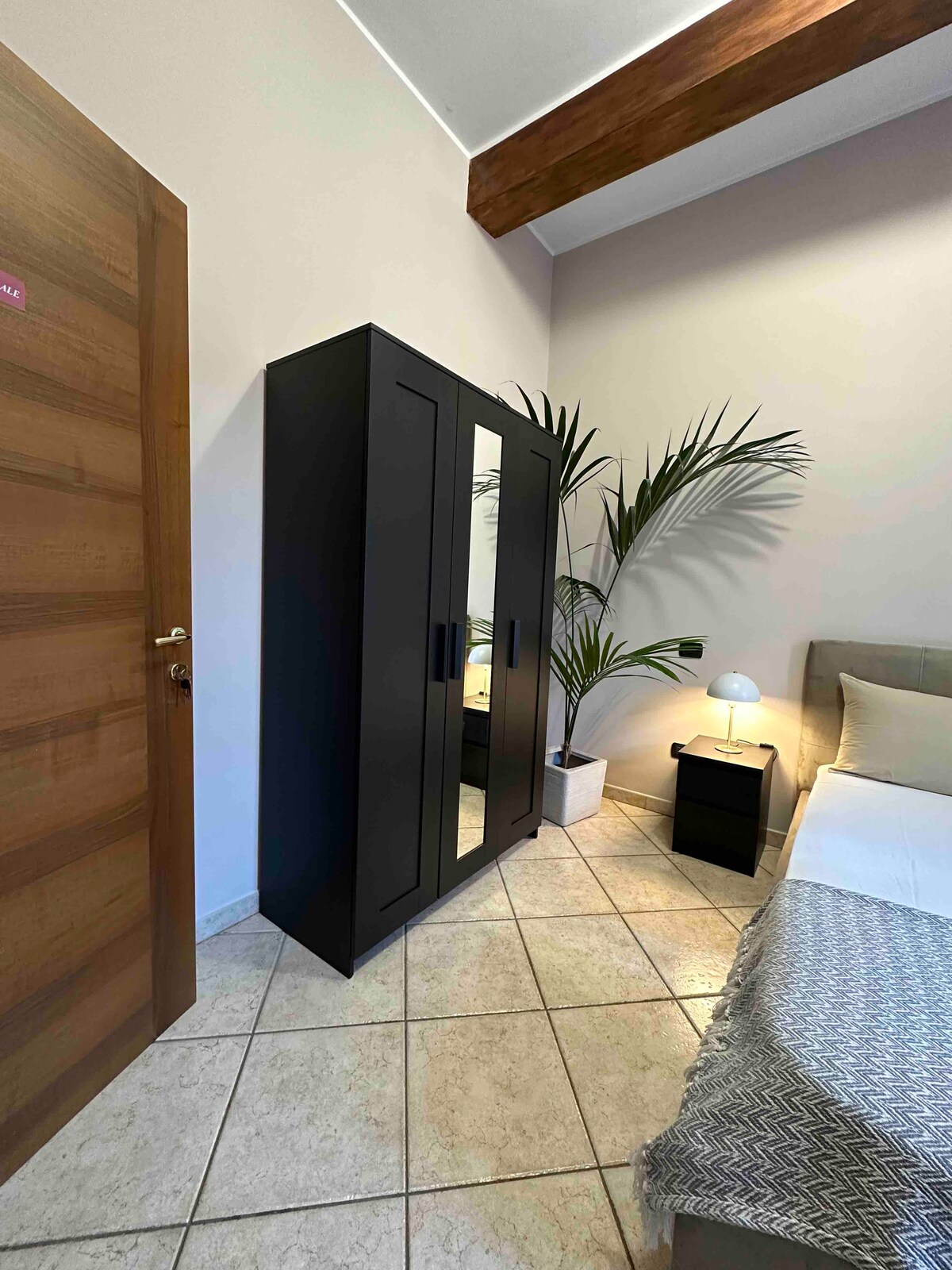 La nostra camera è in stile etnico con un letto matrimoniale in legno naturale così come i comodini, abat jour artigianali e dettagli di arredamento in stile floreale. Angolo per prima colazione con macchina per il caffè in camera. L'alloggio è provvisto di bagno in camera e balcone esclusivo privato da cui si accede attraverso porta-finestra doppia camera per un ottimo isolamento acustico e termico.