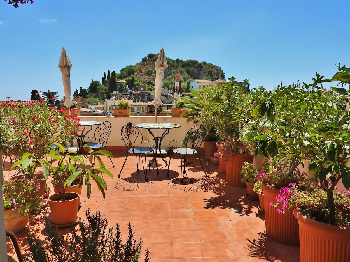 Apartmán se nachází na ulici „FONTANA VECCHIA“ v centru Taorminy, 100 metrů od ITALIAN OPERA TAORMINA, ale zároveň daleko od chaosu. Apartmán s panoramatickým výhledem se skládá z velkého obývacího pokoje s výhledem na moře, ložnice, kuchyně a koupelny. Velký apartmán o rozloze 80 metrů čtverečních
