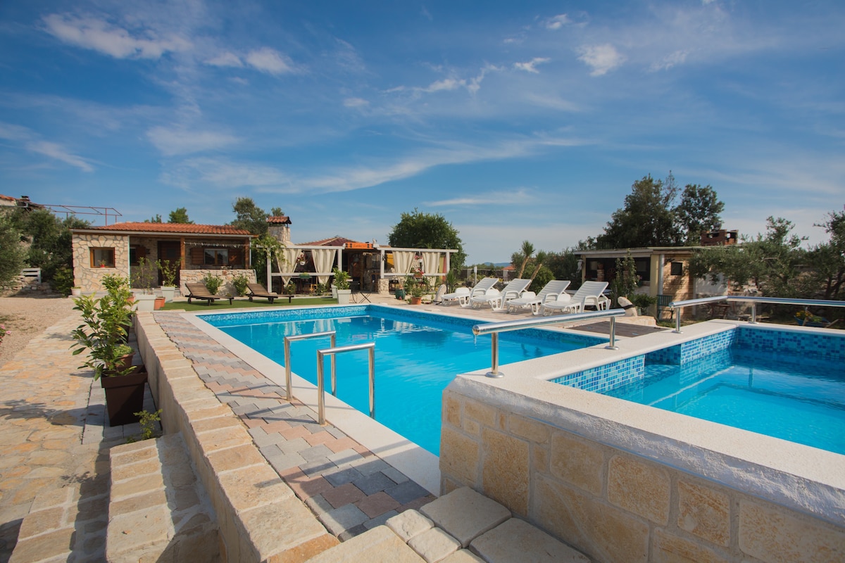 Heated pool, whirpool. Complete rest and peace yet 5 minutes drive distanced from the town Šibenik. Nearby Nacional park Krka and National park Kornati, and little bit more distanced National park Plitvice really gives you the reason to visit this region. Superb house in old dalmatian style is located in spacious yard with the pool, whirpool, children's playground and a Konoba where you can taste delicious Dalmatian cuisine, a lot of beaches to explore. Parking guaranted. Noise and traffic free!