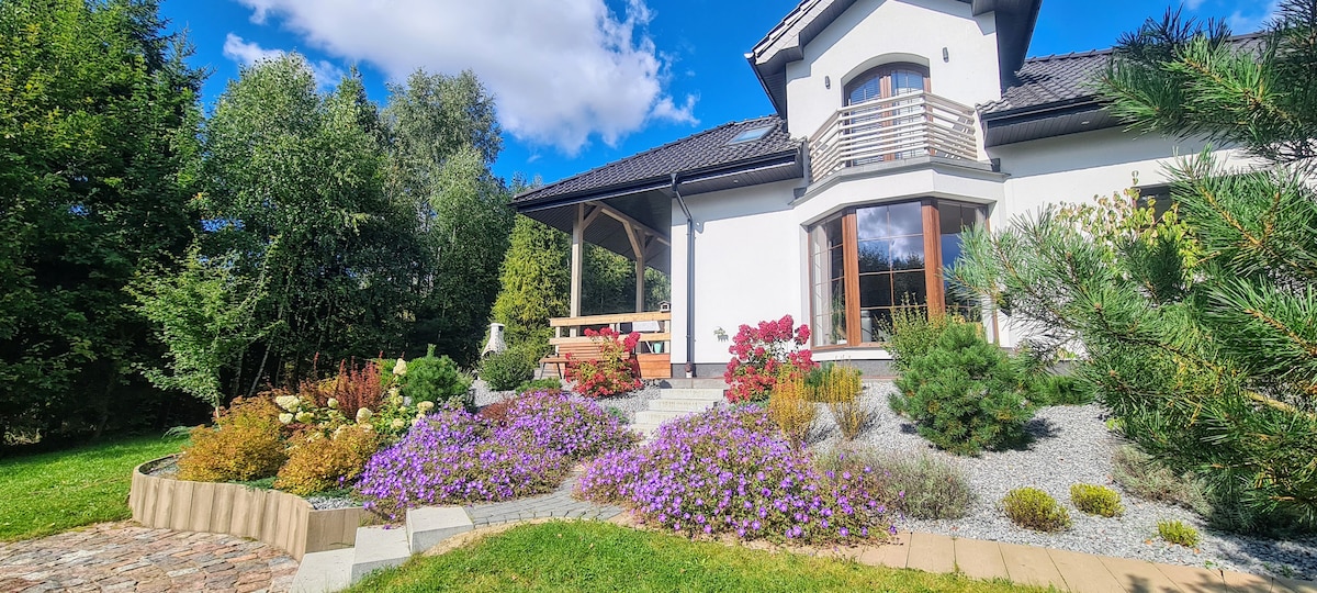 The Bielawy House has been specially designed for relaxation. It features a modern, chlorine-free (active oxygen) heated pool with a massage bench, a 6-person jacuzzi, and a high-quality sauna. The spacious garden includes a playground, ping pong table, monkey bars, trampoline, and volleyball court! Inside the house, guests can relax by the fireplace, play table soccer, Xbox, or poker. The well equipped kitchen provides ideal conditions for cooking. Nearby, there are beautiful lakes and forests
