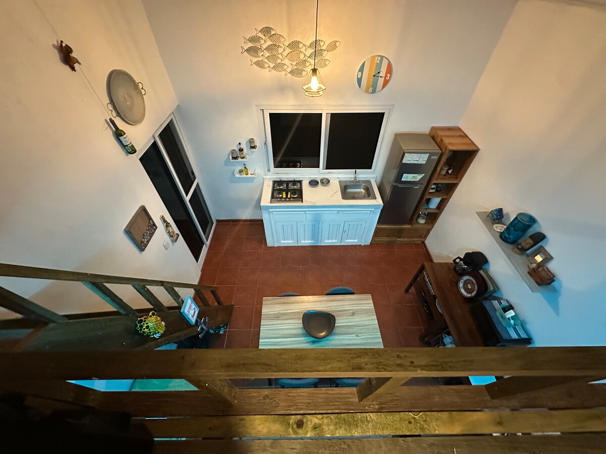 a modern and equipped studio for your comfortable stay composed of 3 main living areas with a Queen bed and its private bathroom, kitchenette and breakfast room with a private balcony overlooking the sea and mountain to enjoy your company in a stylish accommodation, enjoying landscape of mountains and ocean in an ecological environment like in the forest but centrally located in the city.