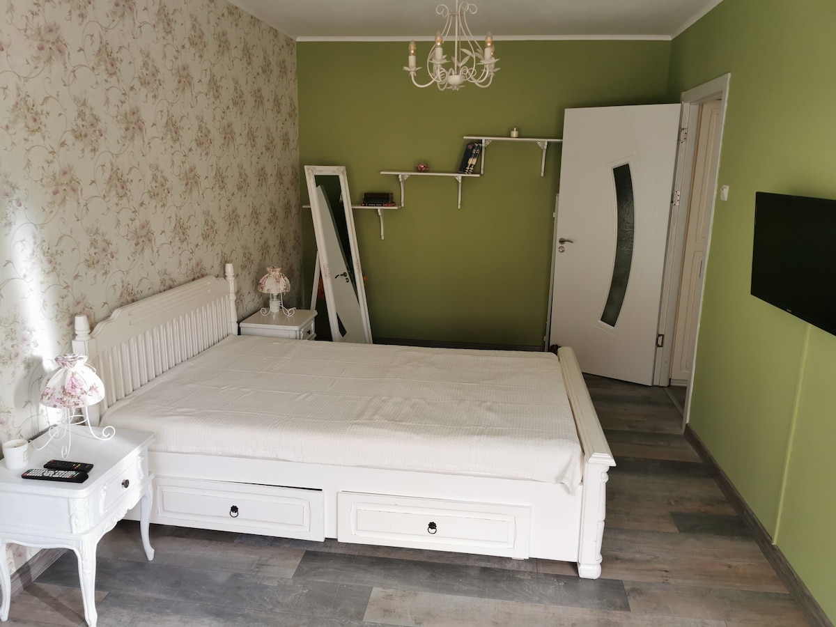 Útulný, světlý a přívětivý byt, 2,5–3 km od centra, v klidné oblasti. Má obývací pokoj s rozkládací pohovkou, ložnici s manželskou postelí, plně vybavenou kuchyň (sporák, lednice, trouba, toustovač a rychlovarná konvice), rychlé Wi-Fi, TV a pračku v samostatném prostoru. Ideální pro krátkodobé nebo delší pobyty se snadným přístupem do města, autobusová zastávka je přes ulici od bloku. Nákupy si můžete udělat v Lidlu a Penny, které jsou vzdáleny 3 minuty chůze. Místo má klimatizaci. 2. patro