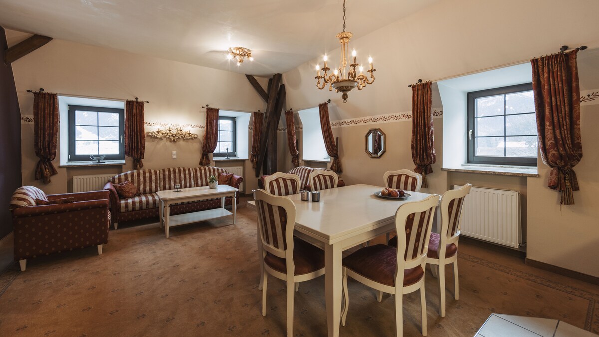 Für Romantiker ist diese Suite genau das Richtige! Die Wohnung ist luxuriös eingerichtet mit eleganten Stilmöbeln und edlen Stoffen. Für zwei Personen ist diese Wohnung ideal! Es stehen dir 36 m² zur Verfügung. Die Suite ist untergebracht in einem ehemaligen Jagdschlössl in der Tiroler Zugspitzarena. Vom Schlössl aus hast du einen Wahnsinnsblick auf das Zugspitzmassiv.