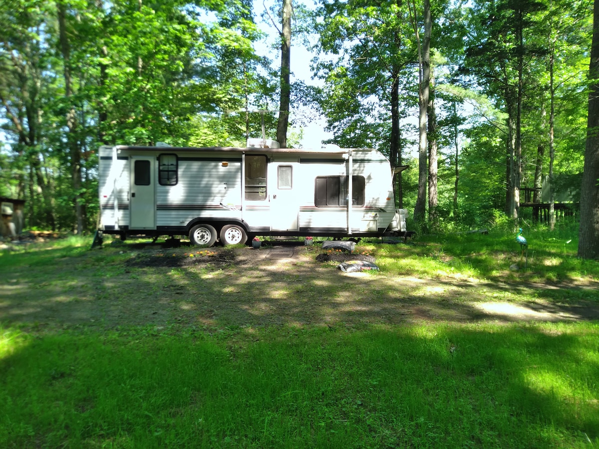 The Rv adventure is located at The Covered Bridge Campground in Livingston Manor NY on an absolutely beautiful creek endless nature. 45 minutes to Bethel woods. There is WiFi on the campground but your in the mountains in the woods. If you want to disconnect and be with the beauty of nature this is the perfect place. Book 2 day for your adventure in the woods with all the comforts of home. We provide all clean bedding, towels, pots, pans, bbq and fire pit.