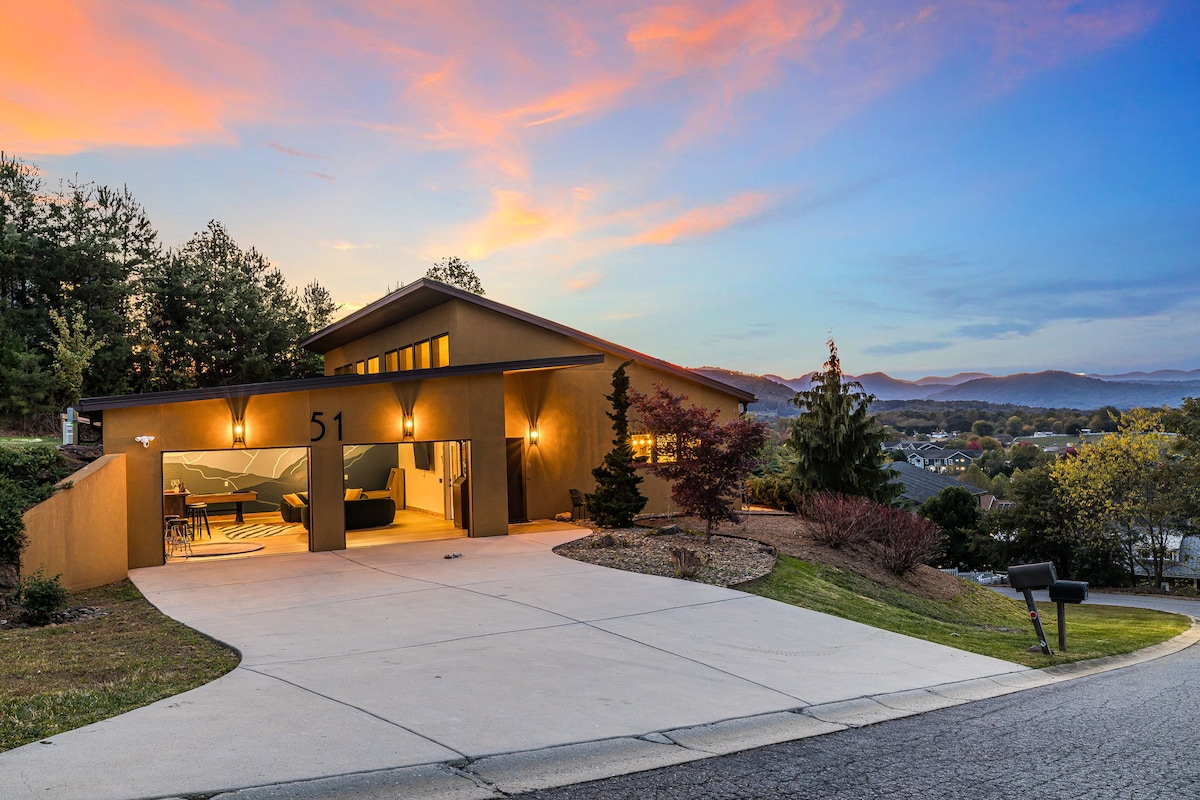 Vítejte ve zbrusu novém luxusním horském ubytování zasazeném do pohoří Blue Ridge v Asheville! Tento soukromý ráj pojme 18 osob a může se pochlubit plnou arkádou, barem s ping pongem a kulečníkovým stolem, vířivkou, dvěma ohništi, vnitřním/venkovním tematickým kinem se 120" plátnem, grilem, oploceným předzahrádkou a basketbalovým košem. Každý detail pro pohodlný pobyt byl pečlivě promyšlen. Jediné, na co musíte myslet, je užívat si kvalitní čas v Asheville s rodinou a přáteli!