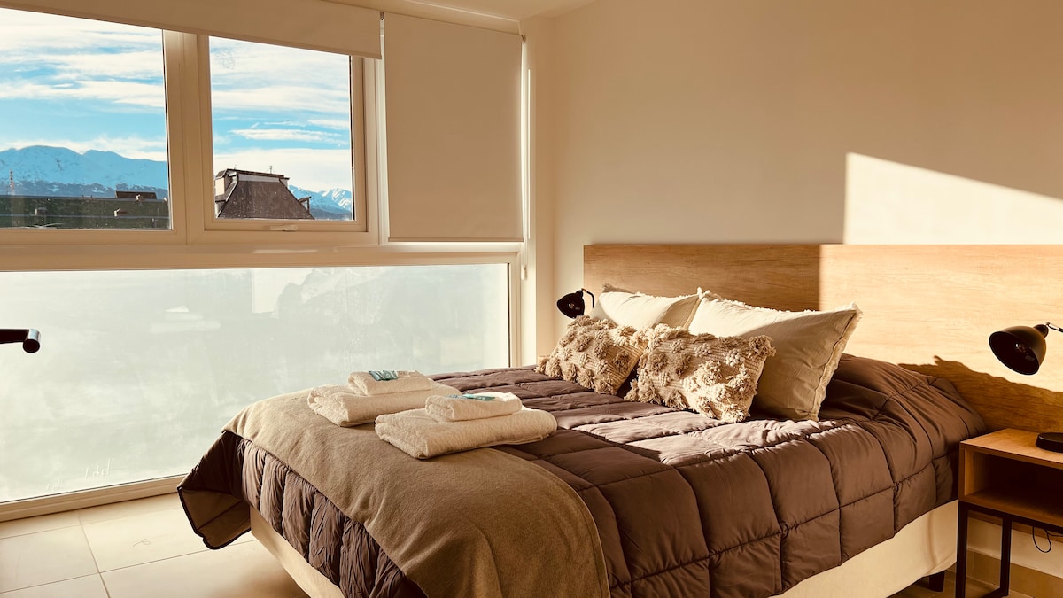 Departamento nuevo para 2 huéspedes (40mts2 cubiertos). Muy luminoso, silencioso y acogedor, con calefacción central regulable, hermosa vista a la ciudad, al canal de Beagle y a las montañas. Localizado a 15 min a pie o 5 min en auto/taxi del centro de la ciudad (Avenida San Martín), y a 15 min en auto/taxi del Aeropuerto Internacional Malvinas Argentinas. **Aclaración importante** EL EDIFICIO NO CUENTA CON ASCENSOR - Hay que subir 2 pisos con escalera.