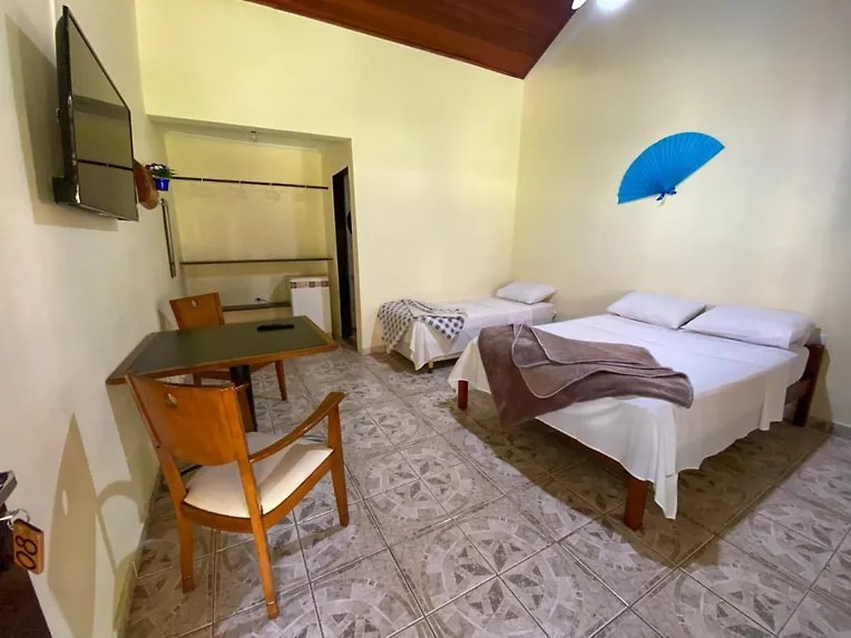 Quartos com banheiro privativo - 20 m2, guarda roupa e cabides. Cama box tamanho padrão, lençóis, toalhas e cobertores limpos. Smart TV 32 polegadas e Wi-Fi. Ar condicionado.