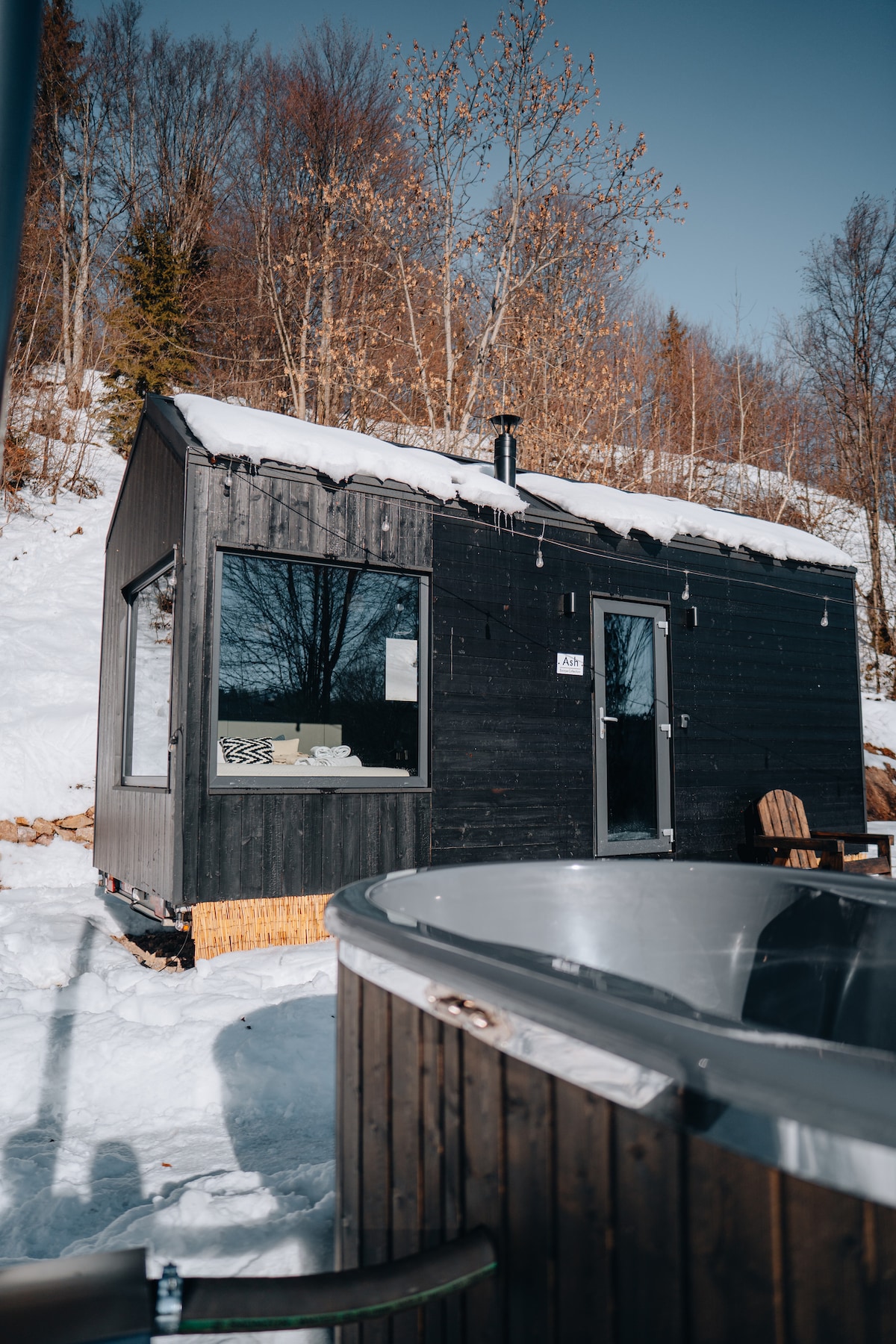 Experience luxury at Ash Cabin, an 18m² forest hideaway with a king bed, panoramic views, loft, underfloor heating and AC, interior fireplace. Unwind in the wood-fired hot tub, grill under the trees or relax by the fire. A secluded, romantic escape close to lakes, caves and trails. Wake up to sunlit forest views, enjoy slow mornings on the terrace and end your evenings in complete silence under the stars. Ideal for couples seeking privacy, comfort and a deep connection to nature.