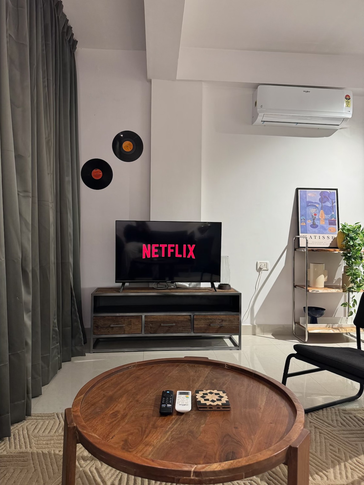 Zažij pohodlí a styl v útočišti navrženém pro práci i relaxaci. Odpočiňte si na ortopedické matraci Wakefit a užijte si teplé ambientní osvětlení. Zachovej si produktivitu díky ergonomickému pracovnímu prostoru a odpočiň si u dvou 42palcových televizorů. Připojená koupelna nabízí prémiové toaletní potřeby a osvětlené zrcadlo. Vař bez námahy v plně vybavené kuchyni. Odpočiň si na pohovce v prostoru, kde se dokonale mísí klid, produktivita a životní styl.