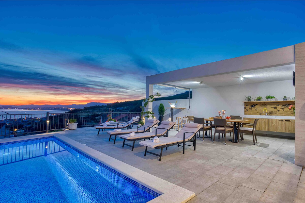 Odpočiň si s rodinou v tomto útulném ubytování. Skládá se z kuchyně s jídelnou, obývacího pokoje, tří ložnic, čtyř koupelen, toalety a posilovny s kulečníkovým stolem. Před domem je bazén, gril, salonky, oplocená část pro děti, soukromé parkoviště a jídelna. Poloha vily poskytuje soukromí a oázu klidu a zároveň má veškeré vybavení potřebné k životu v okolí. It is only 27km (20-25min drive) from Split and 39km from the airport.