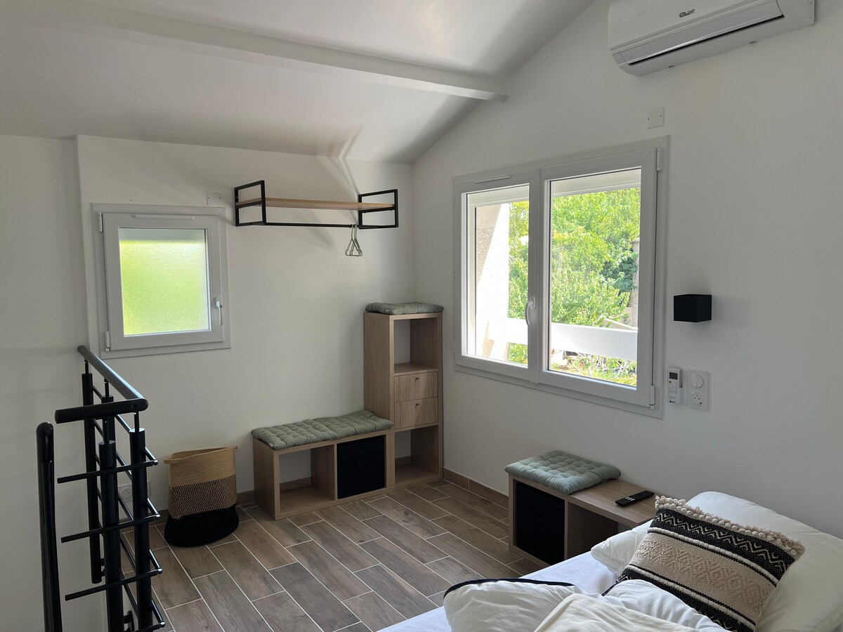Dépendance 27m2 , facon suite parentale à côté de notre villa. piscine en partage avec la maison. Entree privee pas de mur mitoyen avec la villa Une terrasse avec table sous la pergola vous est réservée. linge de lit mis à votre disposition . Ce n’est pas un studio, donc il n y a pas de vraie cuisine ni evier. Cependant l’espace au fond est équipé d’un frigo/ congelateur, micro onde , machine à café, grille pain, vaisselle. Sucre, thé, capsules café à disposition.