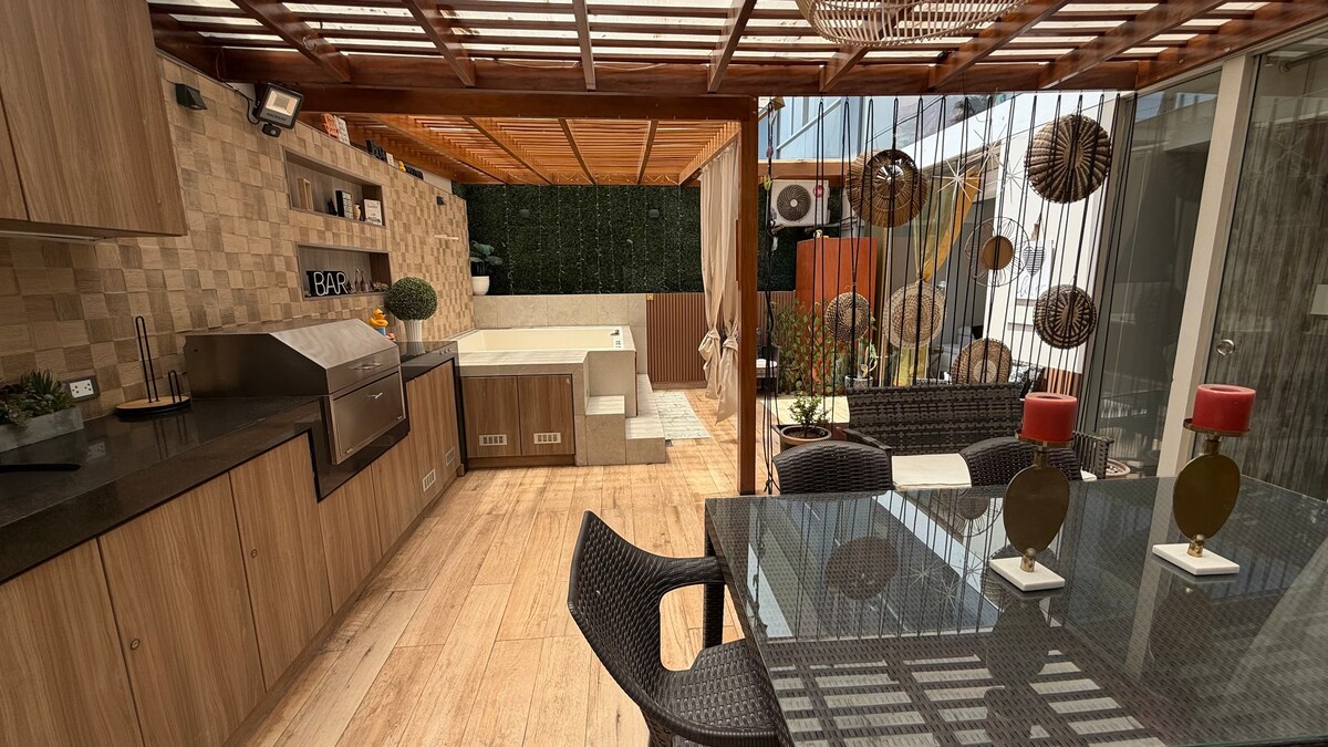 Nádherné, chytré střešní podkroví uprostřed Miraflores s krásným výhledem, skvělou polohou, soukromím a bezpečností. Neomezené Teplá voda na vířivce (Topení modernizováno v poslední době září-22), takže vířivka bude HORKÁ záruka, Polovina kuchyně, LED TV s kabelem Rychlé a spolehlivé Wifi. docházkové vzdálenosti do supermarketů, a všechno. tam je jen jedna stinná stránka jeho na 6. patře s výtahem, ale stojí za to pro zobrazení. Můžete ovládat televizi, hudbu,žaluzie a světla pomocí Alexa.