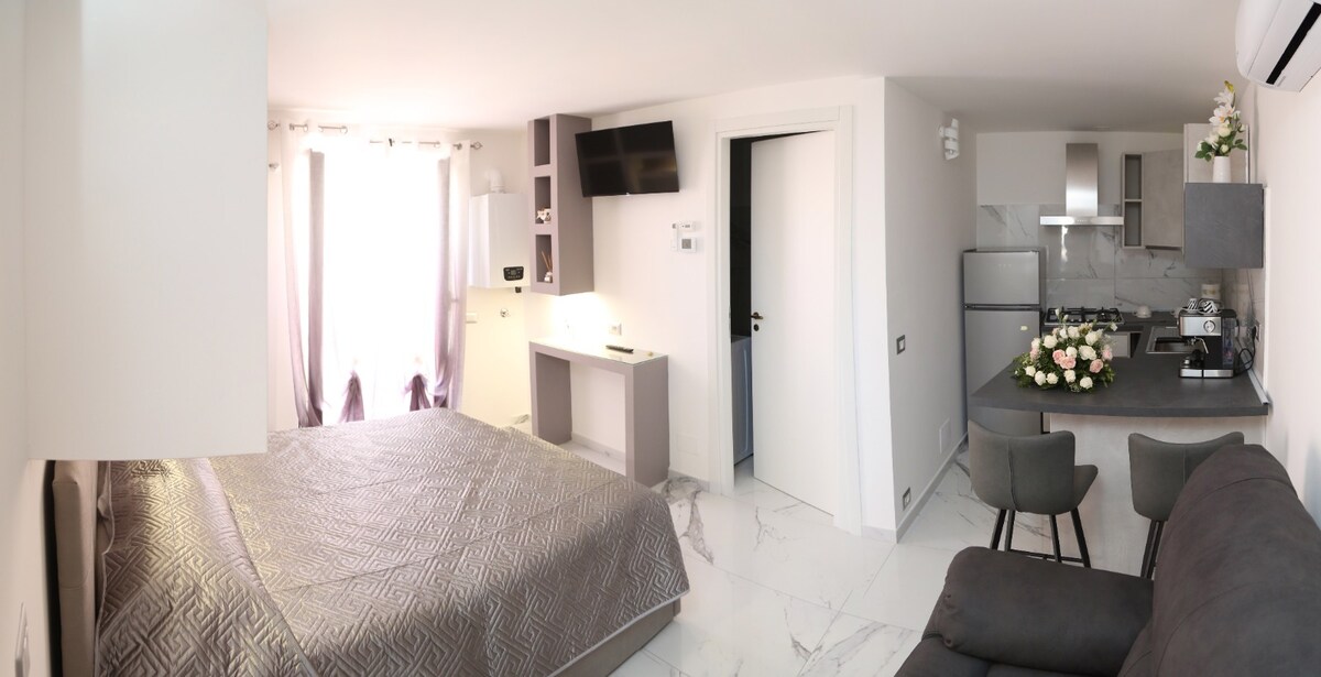 Krásný apartmán byl kompletně zrekonstruován v roce 2021. Apartmán se nachází ve druhém patře starobylé budovy bez výtahu. Byt je vkusně zařízen ve středomořském stylu a zahrnuje manželskou postel, sedací kout, plně vybavenou kuchyň, mramorový stůl a 4 židle, velký šatník, 1 televizi a je vybaven veškerým komfortem a službami, topením a klimatizací, internetem wifi. Byt s výhledem na moře s nádherným výhledem na poloostrov Sorrento