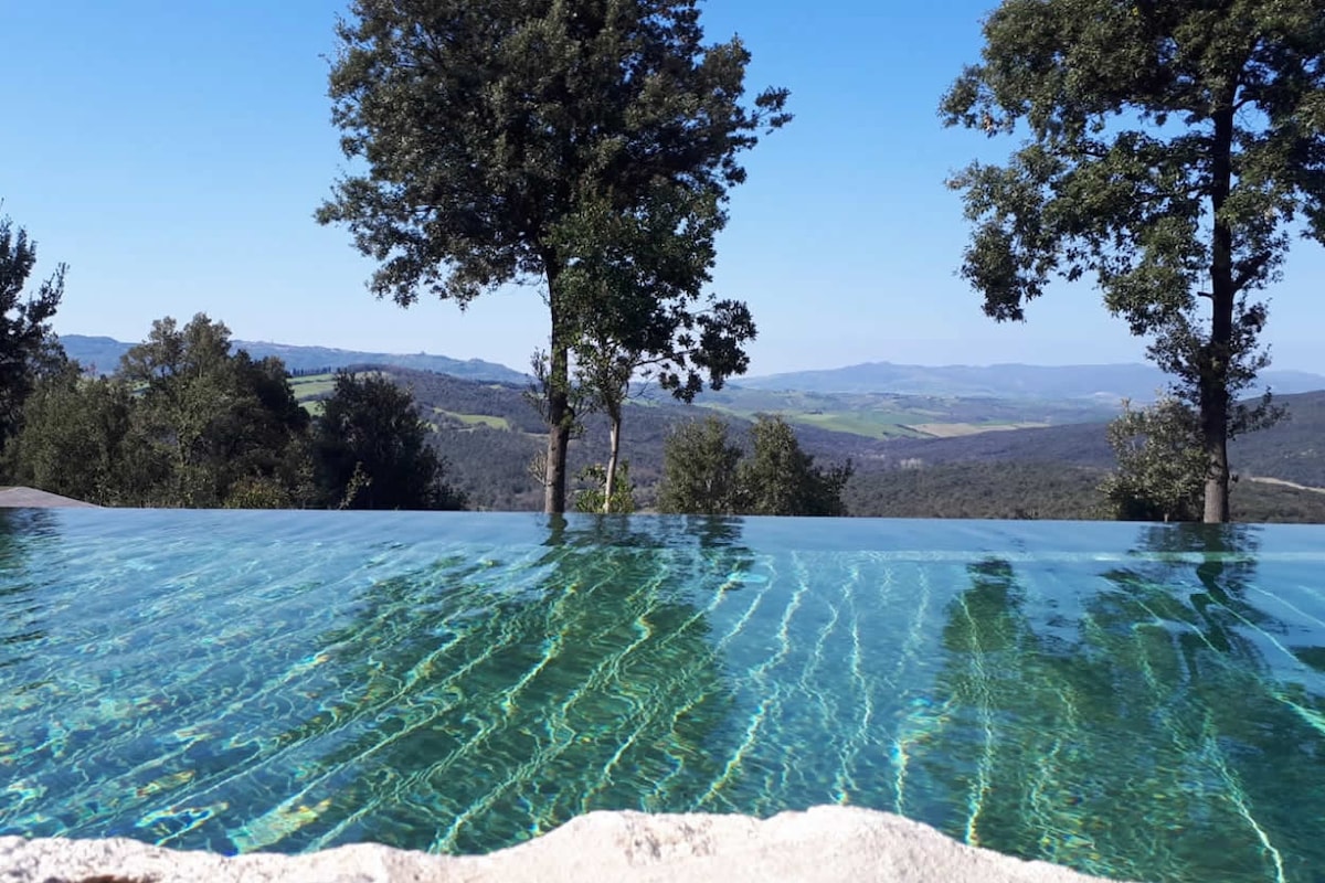 Welcome to La Lunaria di Lajatico, an elegant residence in the Tuscan hills, just a 7-minute walk from the village of Lajatico, hometown of Andrea Bocelli. With two pools, panoramic terraces overlooking rolling hills, olive groves, BBQ, and full modern comfort, it offers four rustic-chic apartments—ideal for families, couples, or groups seeking authentic Tuscany close to town.