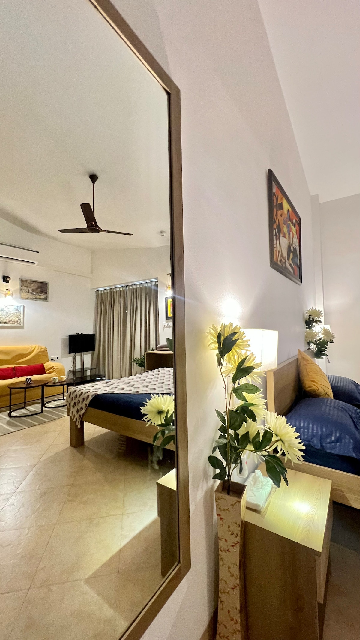 Modern Boho Apartment | Minutes from North Goa's Beaches.A cosy, fully furnished 1BHK retreat perfect for couples, friends, or small families. Highlights: - Stylish boho interiors with a warm vibe - AC in bedroom & living room for comfort - Smart TV + High-speed WiFi - Equipped kitchen with RO water, cooktop, fridge & washing machine - Shared swimming pool (9 AM–6 PM | swimwear mandatory - On-site gym available as a paid facility - 24/7 security for peace of mind - Free Parking