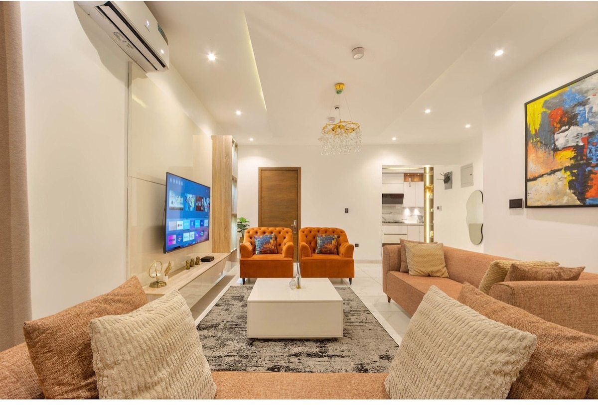 Vítej v Elmstead Luxury Aprt, tvém stylovém útočišti v Lekki Ikota. Tento ráj se 2 ložnicemi a 2 koupelnami nabízí pohodlí klimatizace, 65" televizi v obývacím pokoji, 43" televizi v ložnicích, bezplatnou stabilní neomezenou Wi-Fi a nepřetržité napájení s měničem a solární energií. Užij si samoobslužný proces ubytování pomocí chytrého zámku, parkování zdarma, pračku v ubytování a skákací hrad pro děti. 1 bezplatný úklid u pobytů delších než 5–6 nocí. V blízkosti ochranného centra Lekki, Mega Chicken, Blackbell a Blemco. Ideální pro sólo cestovatele, obchodní hosty, rodiny nebo dlouhodobé pobyty