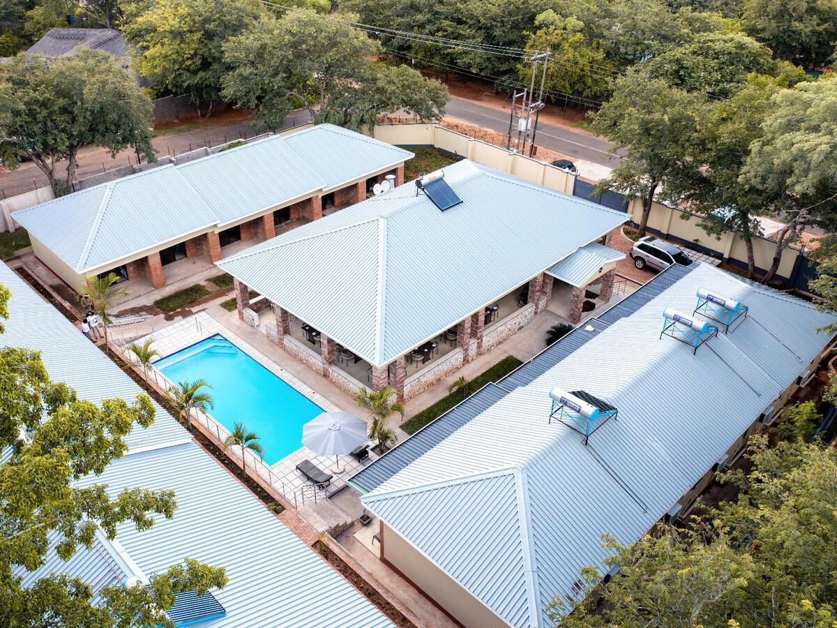 Prostorný nový moderní dům se 4 ložnicemi a 3 koupelnami s vysokorychlostní wifi, plně vybavenou kuchyní, 8 ložnicemi, se záložní solární energií, který se nachází 10 minut od The Magnificent Victoria Falls, jednoho ze sedmi přírodních divů světa. Celý domov budeš mít jen pro sebe, ať už jsi jeden nebo až osm lidí. Užij si pohodlí, na které jsi obvykle zvyklý/á s moderními spotřebiči. 5 minut chůze do města a na dosah hlavních aktivit ve Victoria Falls.