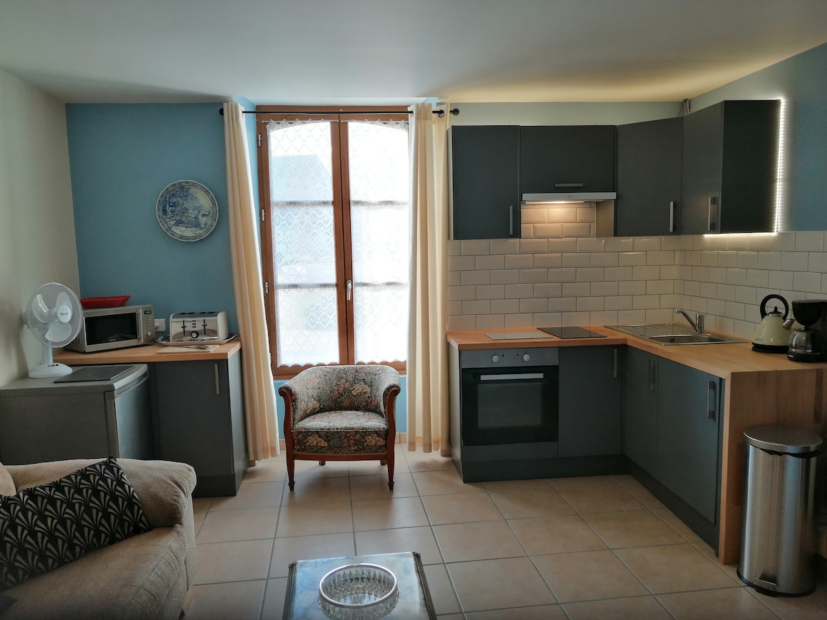 Ubytování v 1. patře městského domu, 5 minut na kole od všech obchodů. (Přístup po venkovním schodišti). Parkování před ubytováním pro zaparkování vašeho vozidla. Kuchyně zahrnuje mikrovlnnou troubu, troubu, lednici, kávovar, varnou konvici, sklokeramickou varnou desku. Najdete zde také pokoj s postelí 140 cm a obývací pokoj s jednolůžkem. -10 minut do centra na kole - veřejné parkoviště před apartmánem nebo 1 minutu od jiného veřejného parkoviště - byt je v patře