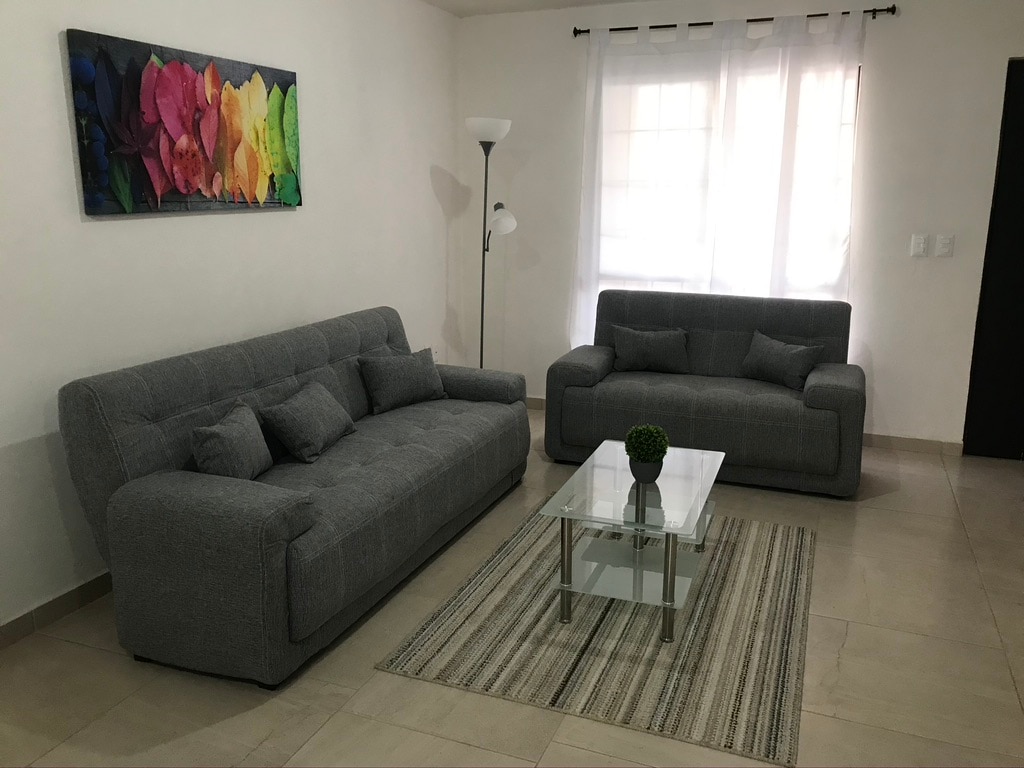 "Disconnect from your worries in this spacious and serene retreat." Ideal for executives or families (non-smoking residence) Elegant dining room, comfortable living room, patio with garden furniture, washer and dryer, fully equipped kitchen, 3 double bedrooms, and a sofa bed, 2 full bathrooms and a half bath, TV room, Wi-Fi, covered parking for 2 cars. Close to downtown, Nissan Plant 1, the airport, shopping centers, restaurants, theaters, and cinemas.