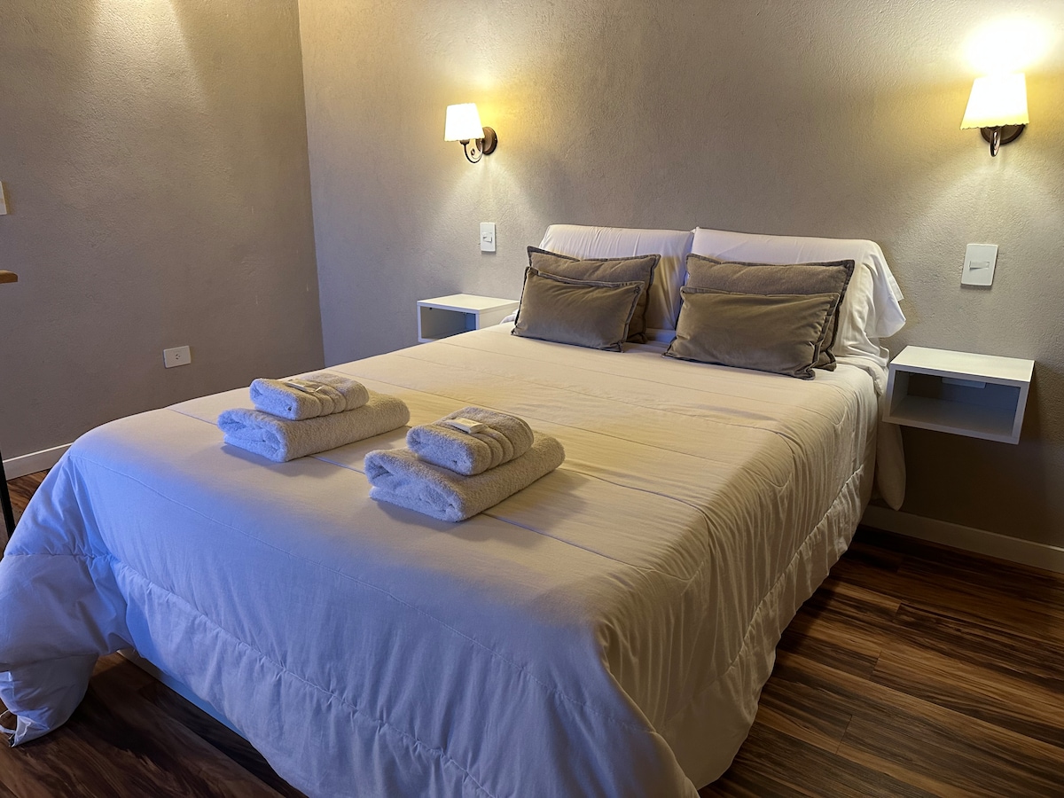 Departamento moniambiente de 50 mts2 con imponente vista sobre el lago y a la Isla Victoria en la zona de Llao Llao. Tiene un pequeño living, cocina completa con horno y microondas, cama king size que dan a un balcón terraza. Baño completo con bañadera Bajada propia a la costa de lago Servicios Wifi Balcón terraza con reposeras Ropa de cama y toallas se cambian c/ 5 días Secador de pelo Estacionamiento privado Exclusivo para parejas No hay desayuno No hay Tv Se cobra limpieza final usd20