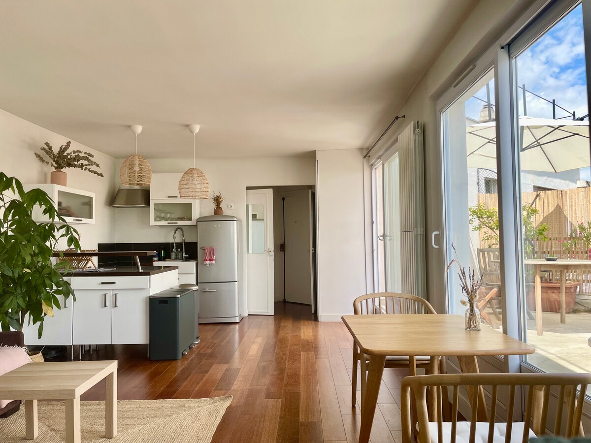 Světlý byt s úchvatným výhledem a terasou. Je to ideální pobyt pro práci na dálku. Byt je ideální pro jednoho nebo pro pár. Je vybaven skvělou kuchyní, koupelnou s vanou a vysokorychlostním připojením k internetu. Byt má ideální polohu, 2 minuty od krásného Parc des Buttes Chaumont a několik minut pěšky od kanálu St Martin a République. Stanice metra Belleville vás dostane do centra města za 10 minut. Upozornění: žádné večírky povoleny.