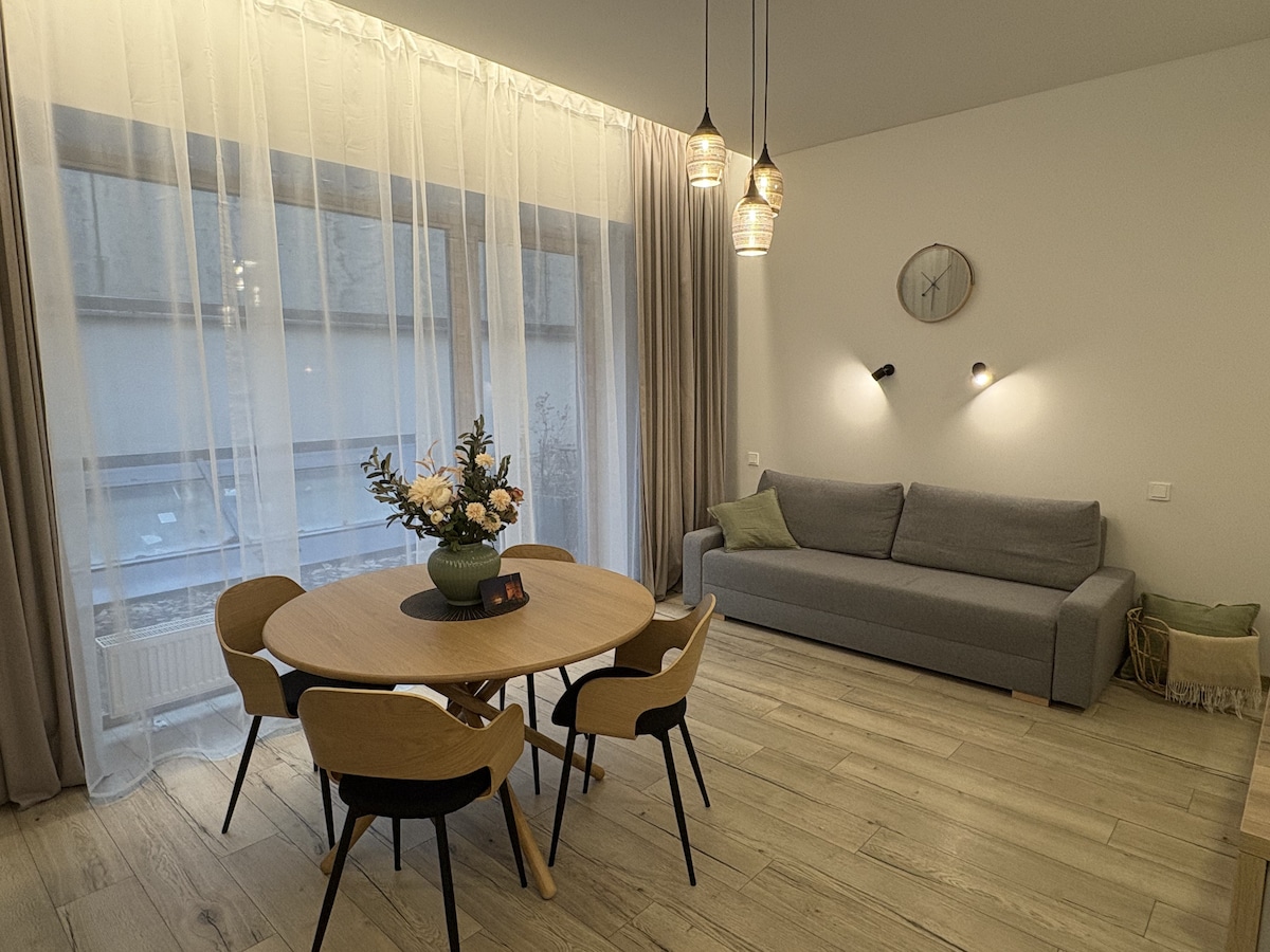 Stylový moderní 1pokojový (2 pokoje) byt (celková velikost ~35 m2) s výhledem do otevřené oblasti přes velká okna. Byt je tichý, velmi světlý a zcela nový s převládajícím přírodním dřevem kolem. Apartmán se nachází na jihozápadním vchodu do starého města Vilniusu. Na hlavní náměstí se dostanete pěšky za 15–20 minut pěknou procházkou malými uličkami starého Vilniusu. Autobusová zastávka je asi 300 m, vlaková stanice asi 500 m, letiště je jen asi 3 km.