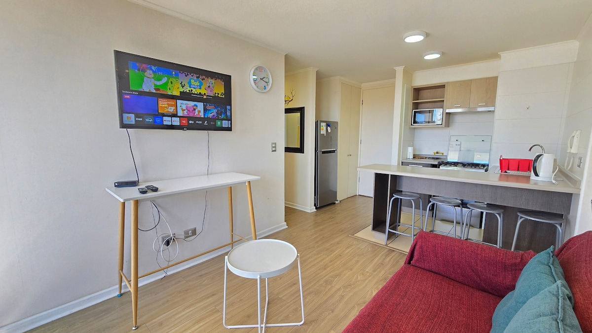 Velkolepé studio, plně zařízené, s manželskou postelí, rozkládacím křeslem, pračkou, kabelovou TV a WIFI. Apartmán se nachází v moderní budově v nejlepší lokalitě Viña del Mar (Calle 9 Norte), 2 bloky od pláže, barů, restaurací. snadný přístup do jakékoli části města. K dispozici je parkoviště. Byt má veškeré vybavení, abyste se cítili jako doma.