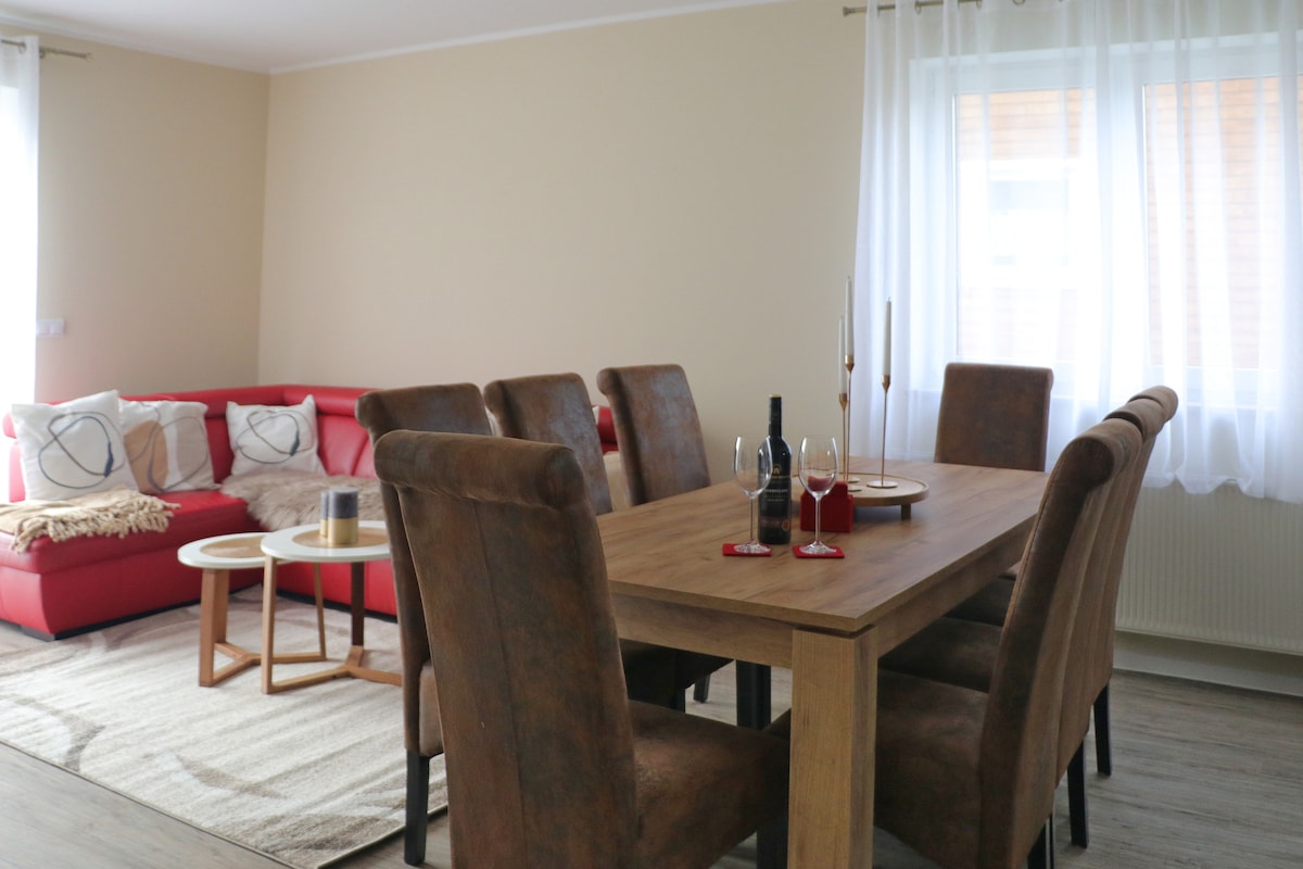 „Heimatgefühl“ - sich wie Zuhause wohlfühlen. Unweit es Mittelpunktes Deutschlands und des Nationalparks Hainich finden Sie unsere stilvoll eingerichtete Ferienwohnung. Hier können Sie nach einem wunderbaren Urlaubstag im gemütlichen Wohnbereich Zeit verbringen, in der voll ausgestatteten Küche kochen oder im schönen Bad mit Dusche und Whirlpool entspannen. Wohlfühlen steht an erster Stelle. Die Ferienwohnung ist besonders für Familien ausgestattet. Wir freuen uns auf Sie!